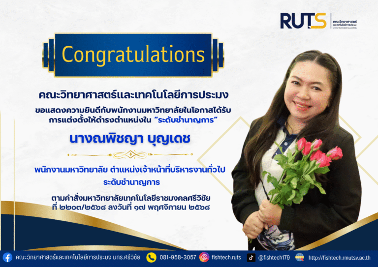คณะวิทยาศาสตร์และเทคโนโลยีการประมง ขอชื่นชมและแสดงความยินดีกับนางสาวบัณฑิตา ฉิมมณี นักศึกษา สาขาวิชาการจัดการทรัพยากรและสิ่งแวดล้อม ชั้นปีที่ 2 ได้รับรางวัล “เพชรเสม็ดขาว” รางวัลความประพฤติดี แก่นักเรียน นิสิต นักศึกษา ทั่วราชอาณาจักร ประจำปีพุทธศักราช 2567 จาก พุทธสมาคมแห่งประเทศไทยในพระบรมราชูปถัมภ์