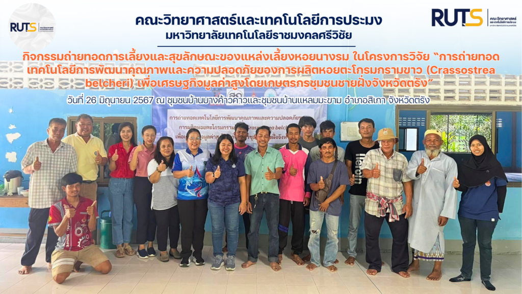 กิจกรรมถ่ายทอดการเลี้ยงและสุขลักษณะของแหล่งเลี้ยงหอยนางรม ในโครงการวิจัย “การถ่ายทอดเทคโนโลยีการพัฒนาคุณภาพและความปลอดภัยของการผลิตหอยตะโกรมกรามขาว (Crassostrea belcheri) เพื่อเศรษฐกิจมูลค่าสูงโดยเกษตรกรชุมชนชายฝั่งจังหวัดตรัง”