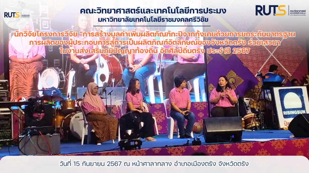 นักวิจัยโครงการวิจัย “การสร้างมูลค่าเพิ่มผลิตภัณฑ์กะปิจากกุ้งเคยด้วยการยกระดับมาตรฐานการผลิตของผู้ประกอบการสู่การเป็นผลิตภัณฑ์อัตลักษณ์ของจังหวัดตรัง ร่วมเสวนา ในงานส่งเสริมภูมิปัญญาท้องถิ่น อัตศิลป์ถิ่นตรัง ประจำปี 2567