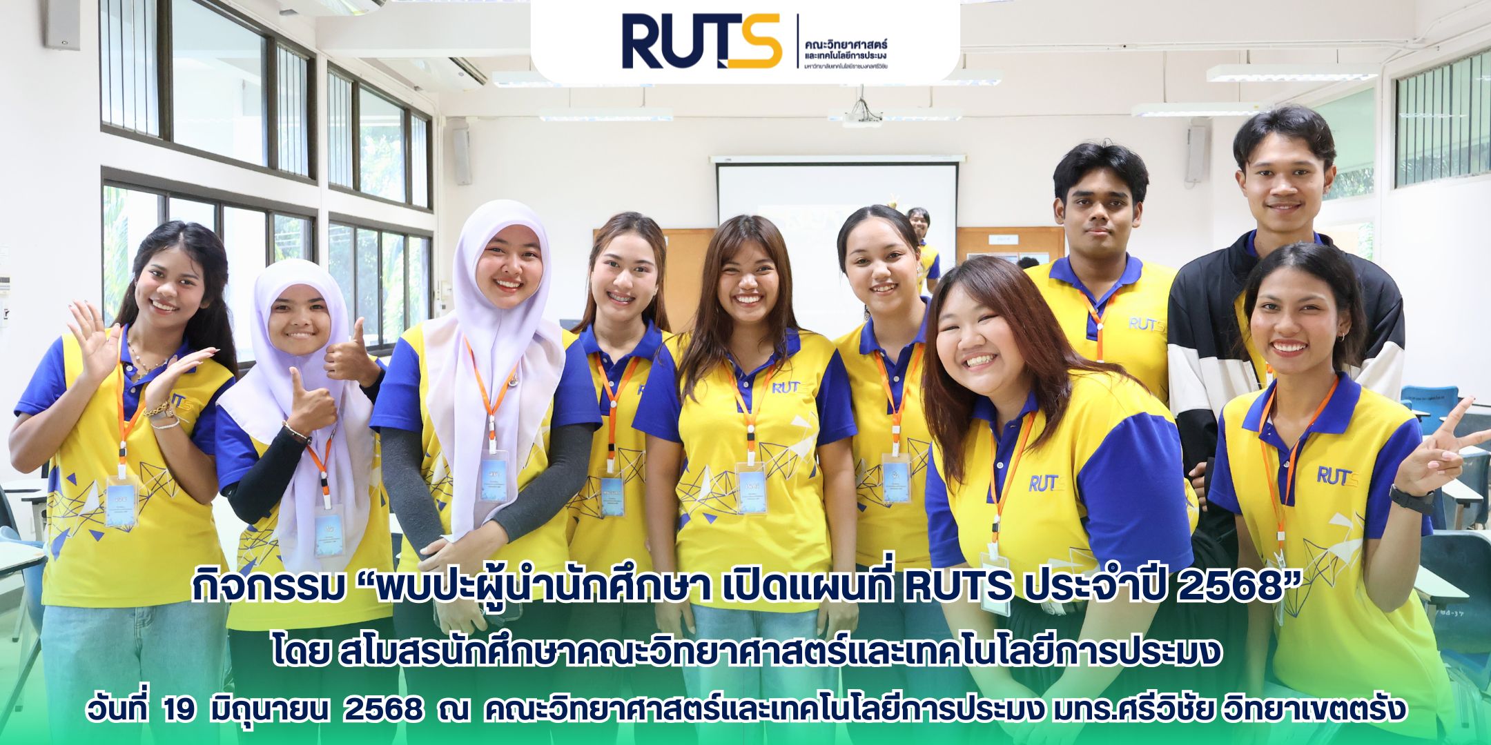 ก้าวแรกสู่รั้วมหาวิทยาลัย เริ่มต้นด้วยแรงบันดาลใจจากพี่ ๆ ในกิจกรรม “พบปะผู้นำนักศึกษา เปิดแผนที่ RUTS ประจำปี 2568” โดยมี สโมสรนักศึกษาคณะวิทยาศาสตร์และเทคโนโลยีการประมง เปิดประตูสู่โลกใหม่ให้น้อง ๆ ชั้นปี 1 ปีการศึกษา 2568 ด้วยรอยยิ้ม ความอบอุ่น และแนะแนวจากใจพี่สู่ใจน้อง ในวันจันทร์ที่ 23 มิถุนายน 2568 ณ มหาวิทยาลัยเทคโนโลยีราชมงคลศรีวิชัย วิทยาเขตตรัง