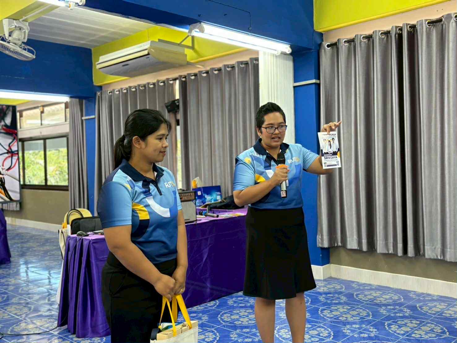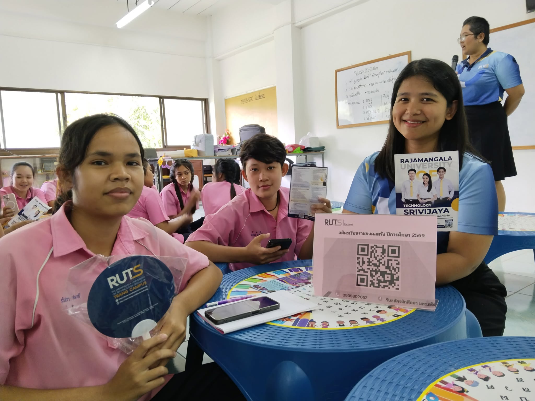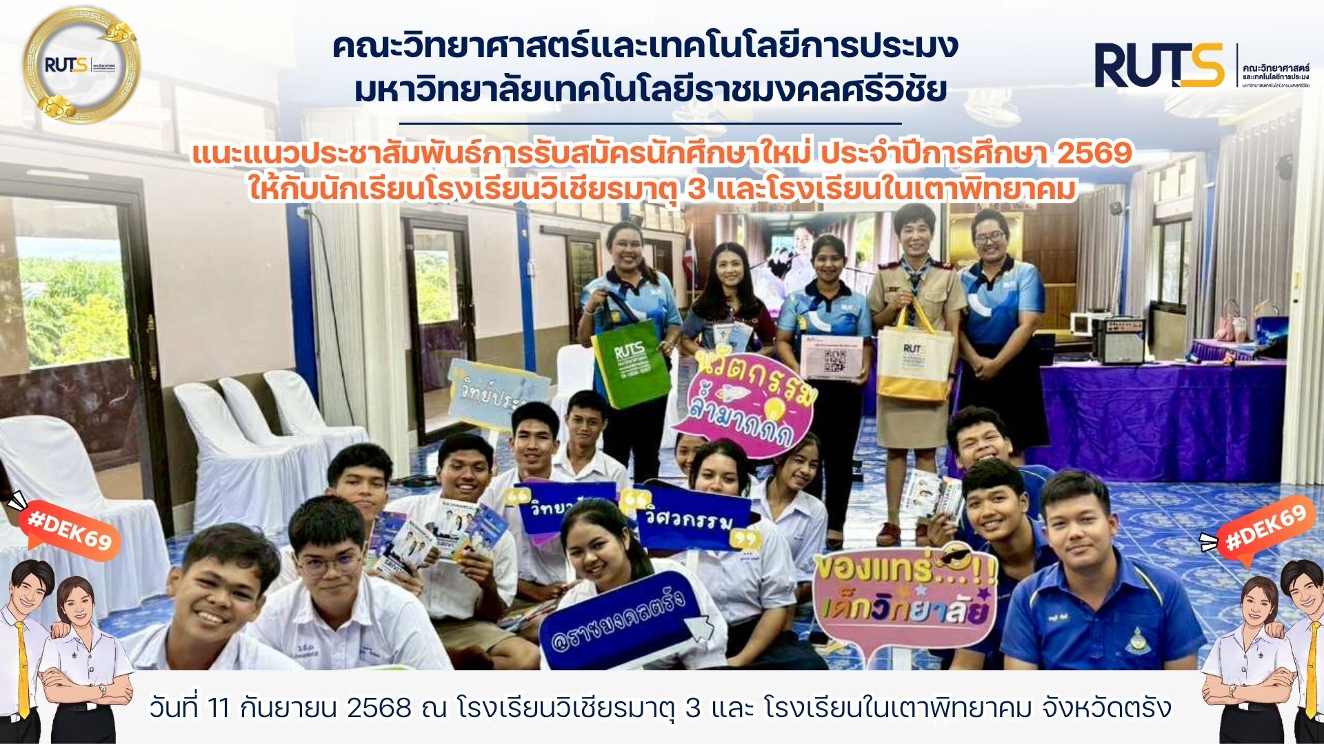 นางสาวกนกวรรณ จู้ห้อง บุคลากรคณะวิทยาศาสตร์และเทคโนโลยีการประมง พร้อมด้วย บุคลากรงานรับสมัครนักศึกษา มหาวิทยาลัยเทคโนโลยีราชมงคลศรีวิชัย วิทยาเขตตรัง เข้าแนะแนวการเข้าศึกษาต่อให้กับน้อง ๆ โรงเรียนวิเชียรมาตุ 3 และ โรงเรียนในเตาพิทยาคม จังหวัดตรัง เมื่อวันที่ 11 กันยายน 2568 ในโครงการแนะแนวสัญจร ประชาสัมพันธ์หลักสูตรการศึกษาต่อระดับปริญญาตรี ประจำปีการศึกษา 2569