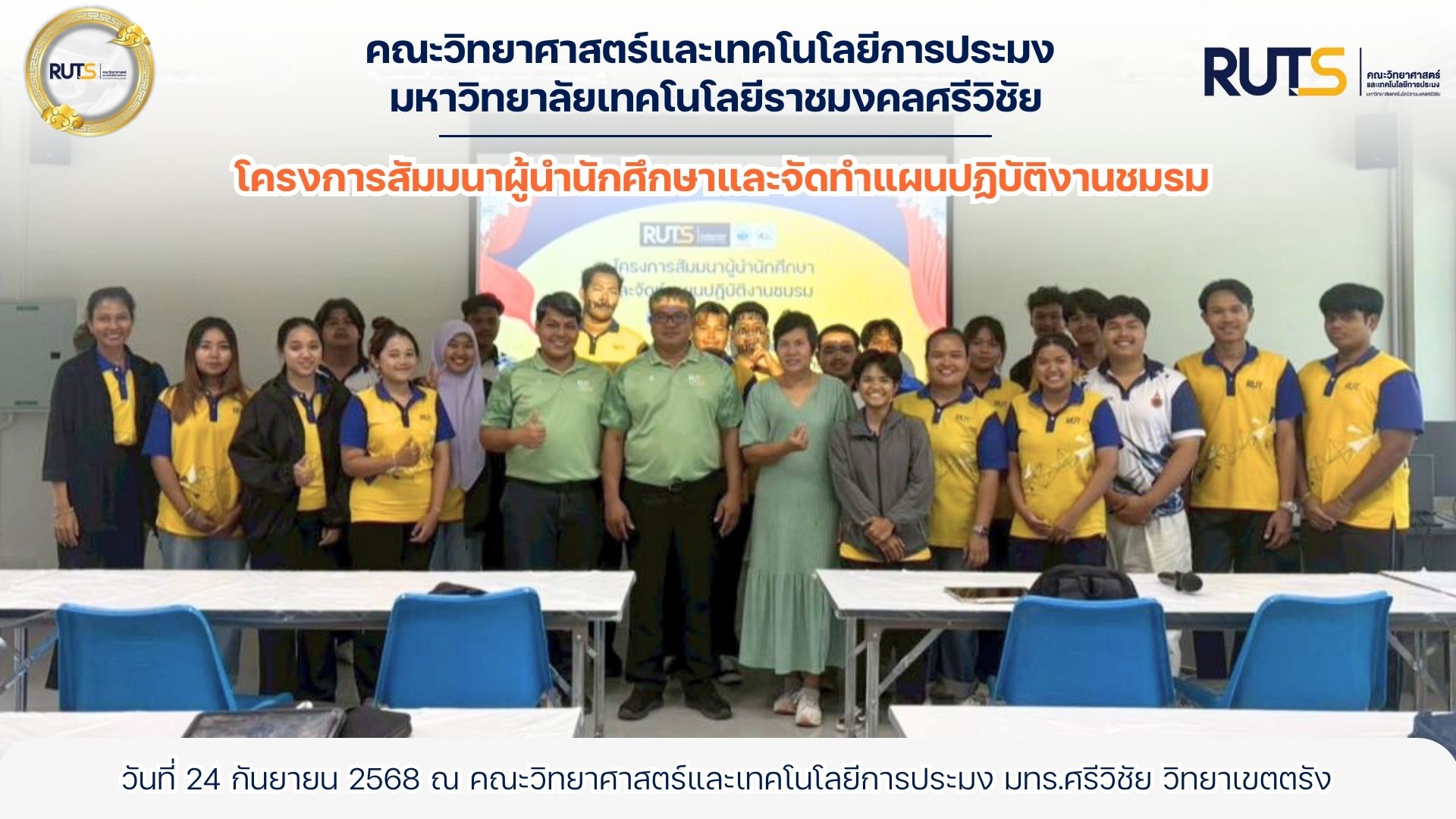 สโมสรนักศึกษาคณะวิทยาศาสตร์และเทคโนโลยีการประมง จัดโครงการสัมมนาผู้นำนักศึกษาและจัดทำแผนปฏิบัติงานชมรม ในวันพุธที่ 24 กันยายน 2568 ณ ห้อง พล 1202 อาคารสำนักงานคณบดี คณะวิทยาศาสตร์และเทคโนโลยีการประมง มหาวิทยาลัยเทคโนโลยีราชมงคลศรีวิชัย วิทยาเขตตรัง