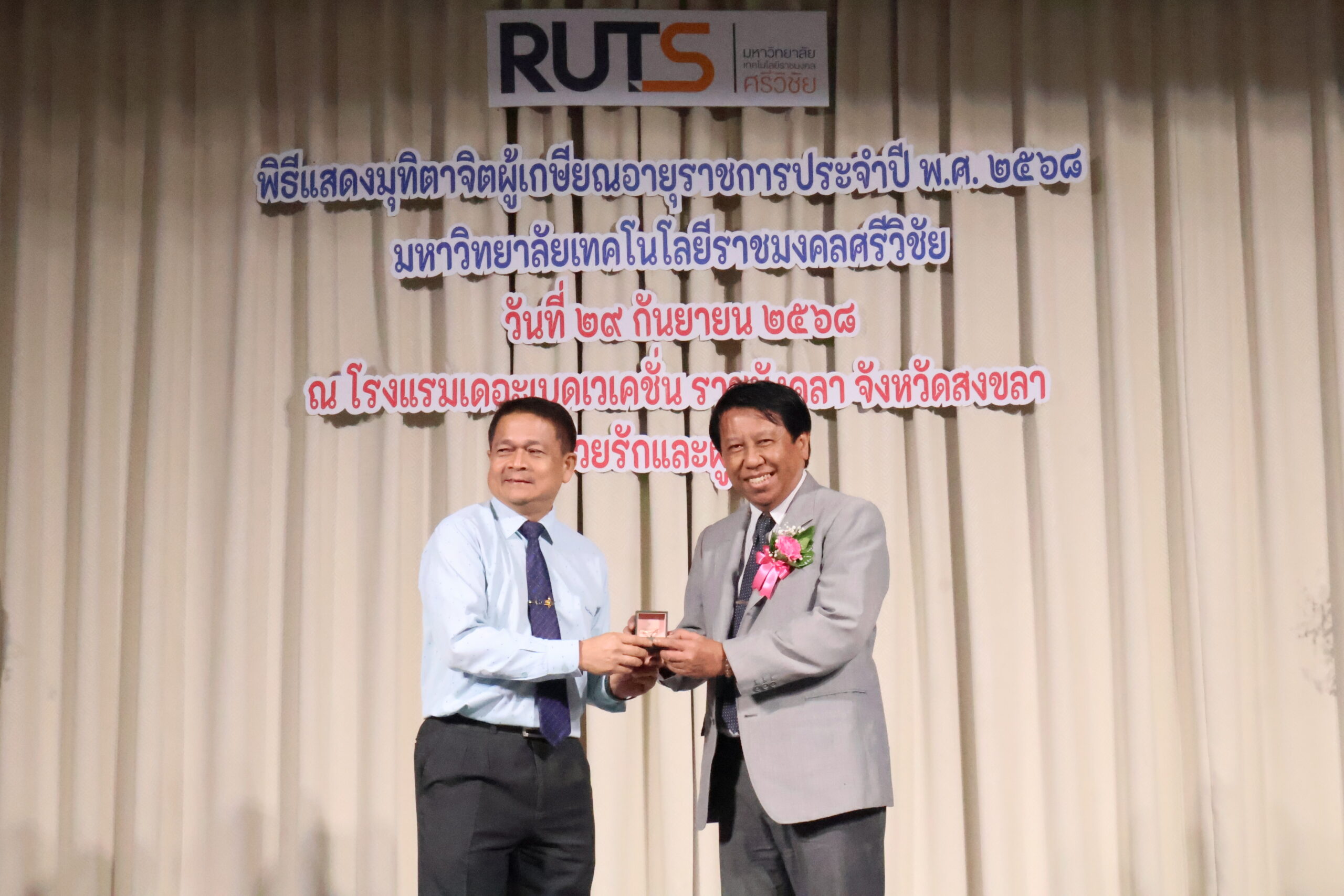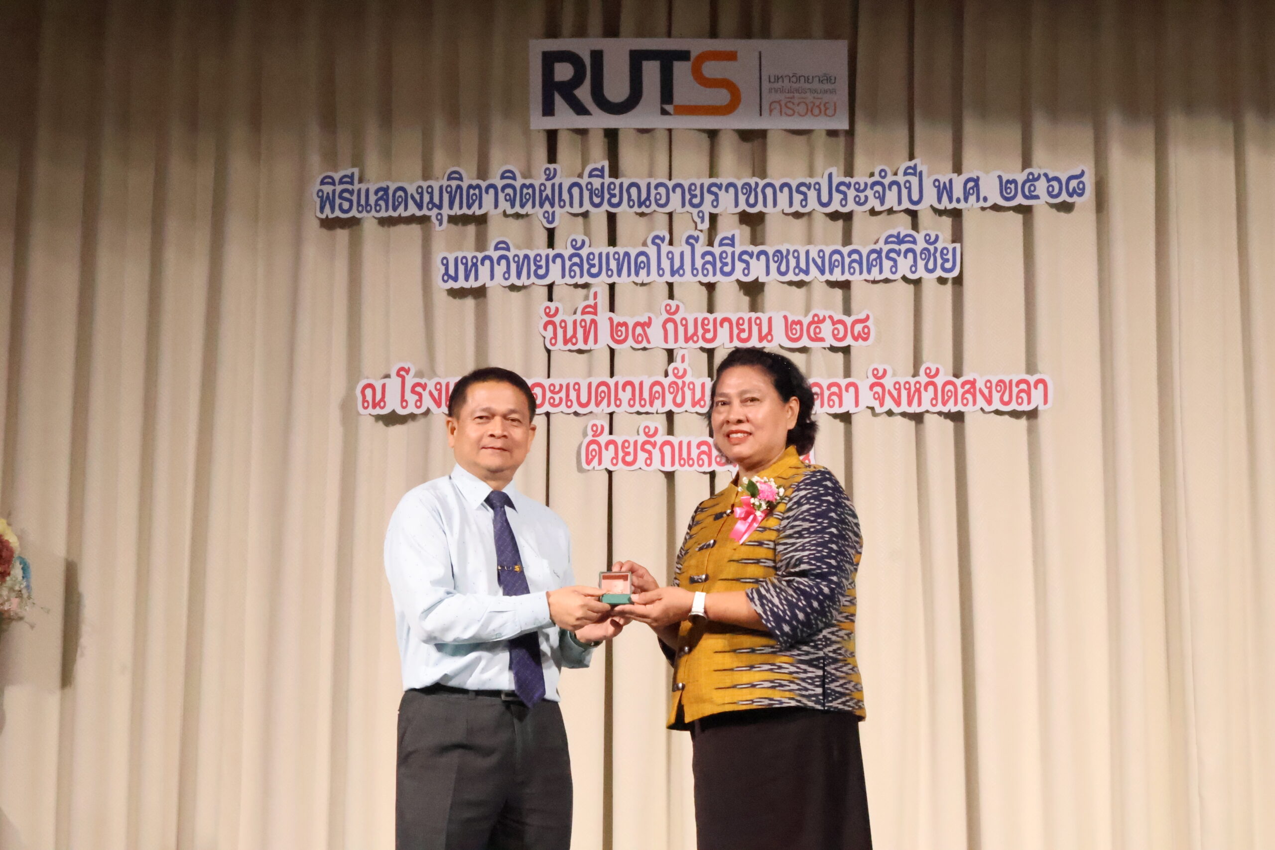 มหาวิทยาลัยเทคโนโลยีราชมงคลศรีวิชัย จัดพิธีแสดงมุทิตาจิตแด่ผู้เกษียณอายุราชการ ประจำปี พ.ศ. 2568 ณ โรงแรมเดอะเบด เวเคชั่น ราชมังคลา จังหวัดสงขลา โดยได้รับเกียรติจาก ศาสตราจารย์ ดร.สุวัจน์ ธัญรส อธิการบดีมหาวิทยาลัย เป็นประธานในพิธี พร้อมมอบของที่ระลึกเพื่อแสดงความขอบคุณและเชิดชูเกียรติแก่ผู้เกษียณอายุราชการที่ได้อุทิศตนปฏิบัติหน้าที่ด้วยความมุ่งมั่นและเสียสละตลอดระยะเวลาราชการ