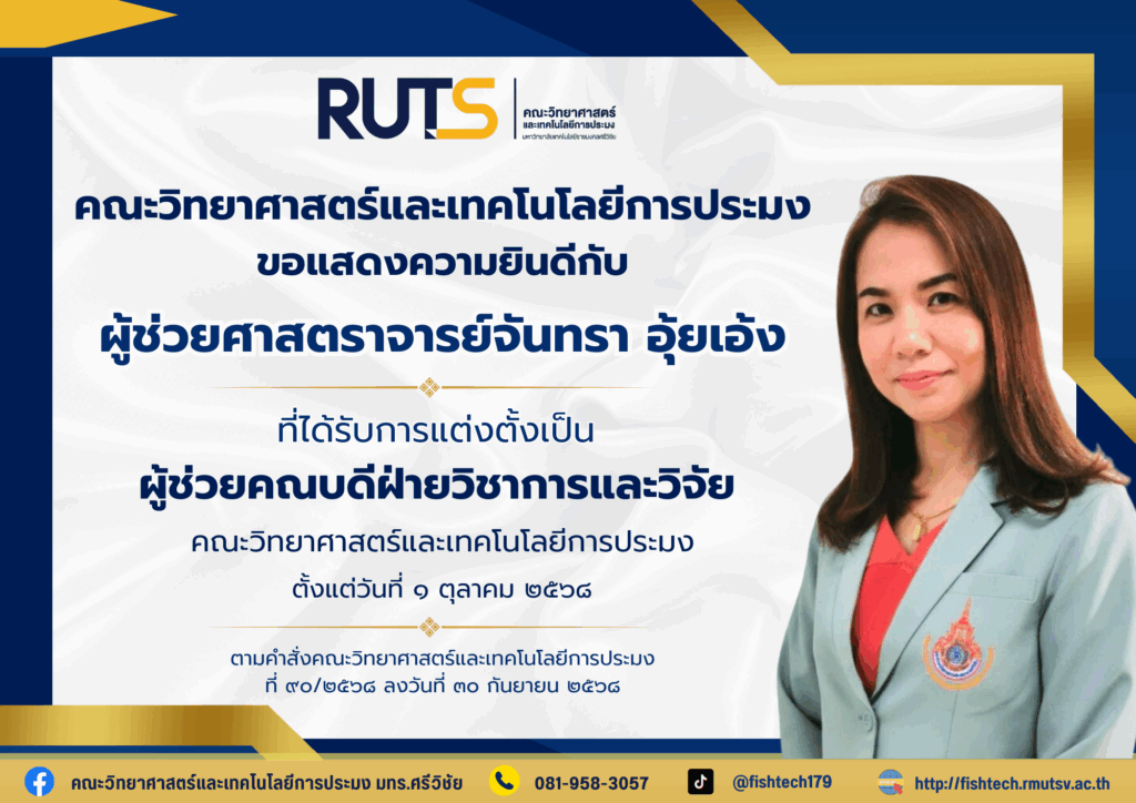 คณะวิทยาศาสตร์และเทคโนโลยีการประมง ขอแสดงความยินดีกับ ผู้ช่วยศาสตราจารย์จันทรา อุ้ยเอ้ง ที่ได้รับการแต่งตั้งเป็น “ผู้ช่วยคณบดีฝ่ายวิชาการและวิจัย” คณะวิทยาศาสตร์และเทคโนโลยีการประมง ตั้งแต่วันที่ ๑ ตุลาคม ๒๕๖๘ ตามคำสั่งคณะวิทยาศาสตร์และเทคโนโลยีการประมง ที่ ๙๐/๒๕๖๘ ลงวันที่ ๓๐ กันยายน ๒๕๖๘