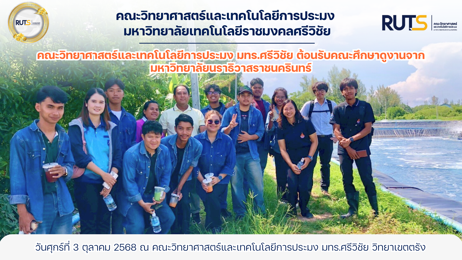 ผู้ช่วยศาสตราจารย์ ดร.มาโนช ขำเจริญ คณบดีคณะวิทยาศาสตร์และเทคโนโลยีการประมง มหาวิทยาลัยเทคโนโลยีราชมงคลศรีวิชัย วิทยาเขตตรัง พร้อมด้วยอาจารย์ทินวุฒิ ล่องพริก หัวหน้าหน่วยวิสาหกิจศึกษา คณาจารย์ และนักวิชาการประมง ให้การต้อนรับ คณาจารย์และนักศึกษาจากคณะเกษตรศาสตร์ มหาวิทยาลัยนราธิวาสราชนครินทร์ อำเภอเมืองนราธิวาส จังหวัดนราธิวาส ในโอกาสเข้าเยี่ยมชมและศึกษาดูงานด้านการเพาะเลี้ยงสาหร่ายและการบริหารจัดการฟาร์ม ในวันศุกร์ที่ 3 ตุลาคม 2568 ณ คณะวิทยาศาสตร์และเทคโนโลยีการประมง