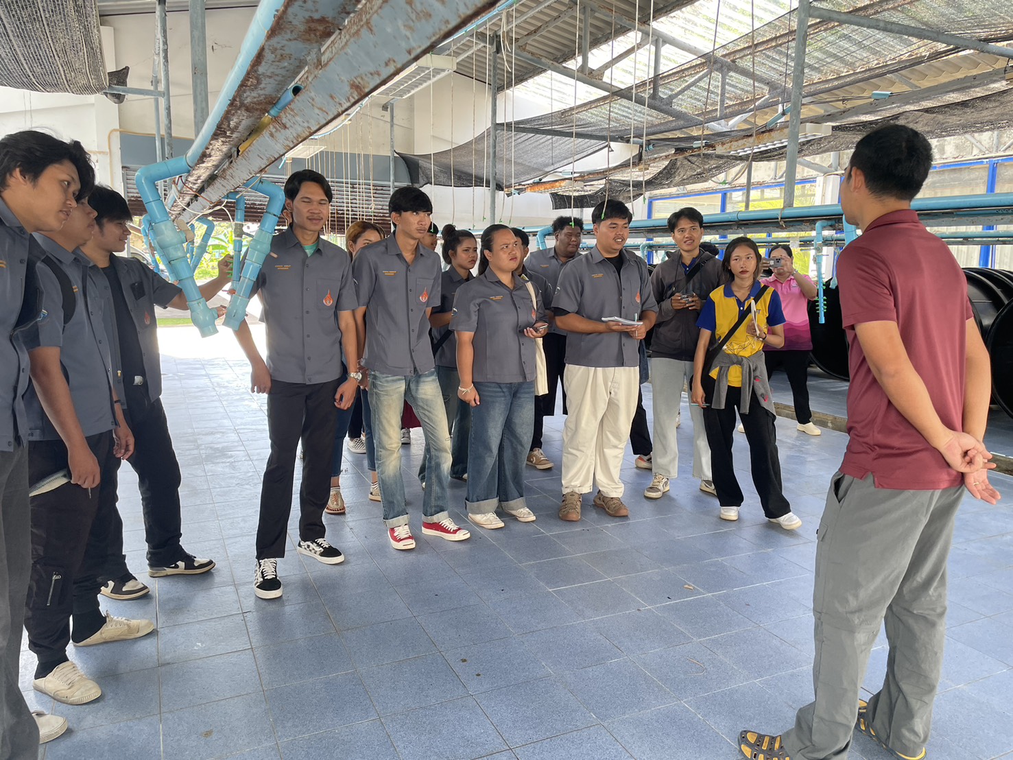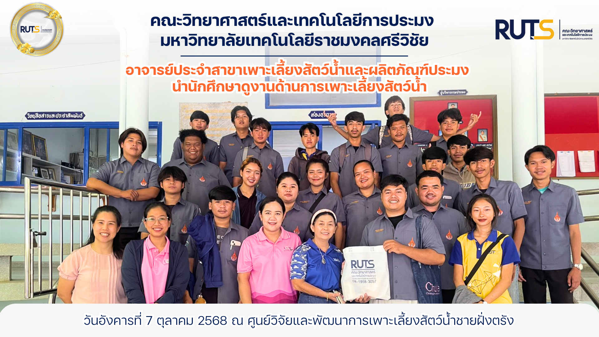 ดร.กันย์สินี พันธ์วนิชดำรง อาจารย์ประจำสาขาเพาะเลี้ยงสัตว์น้ำและผลิตภัณฑ์ประมง คณะวิทยาศาสตร์และเทคโนโลยีการประมง มหาวิทยาลัยเทคโนโลยีราชมงคลศรีวิชัย วิทยาเขตตรัง และเป็นอาจารย์ผู้รับผิดชอบรายวิชาเศรษฐศาสตร์เพื่อการเพาะเลี้ยงสัตว์น้ำ ได้นำนักศึกษาชั้นปีที่ 3 สาขาวิชาเพาะเลี้ยงสัตว์น้ำ จำนวน 24 คน เข้าศึกษาดูงาน ณ ศูนย์วิจัยและพัฒนาการเพาะเลี้ยงสัตว์น้ำชายฝั่งตรัง เมื่อวันที่ 7 ตุลาคม 2568