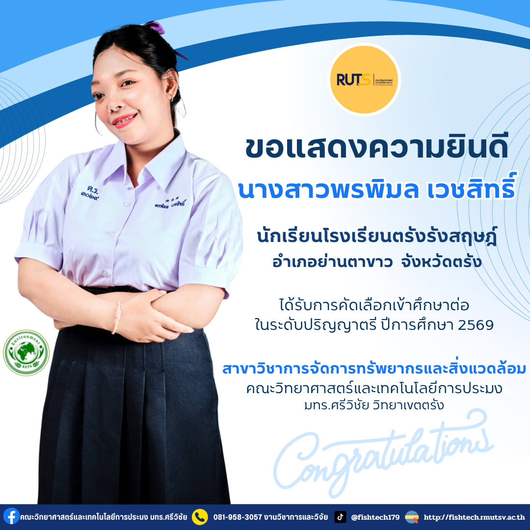 คณะวิทยาศาสตร์และเทคโนโลยีการประมง ยินดีต้อนรับและขอแสดงความยินดี กับ นางสาวพรพิมล เวชสิทธิ์ นักเรียนโรงเรียนตรังรังสฤษฎ์ อำเภอย่านตาขาว จังหวัดตรัง ผ่านการคัดเลือกเข้าศึกษาต่อระดับปริญญาตรี ปีการศึกษา 2569 ในสาขาวิชาการจัดการทรัพยากรและสิ่งแวดล้อม คณะวิทยาศาสตร์และเทคโนโลยีการประมง มหาวิทยาลัยเทคโนโลยีราชมงคลศรีวิชัย วิทยาเขตตรัง