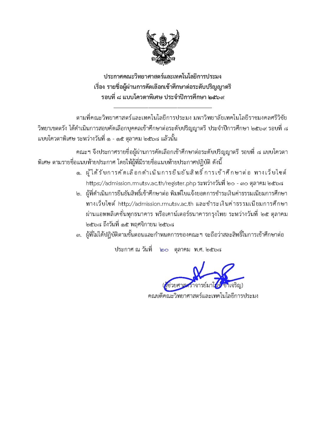 - ผู้ได้รับการคัดเลือกดำเนินการยืนยันสิทธิ์การเข้าศึกษาต่อ ระหว่างวันที่ 20 – 30 ตุลาคม 2568