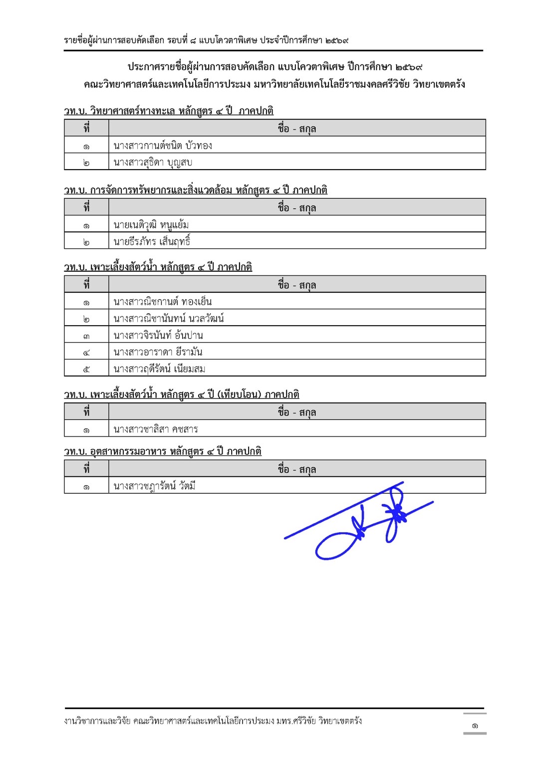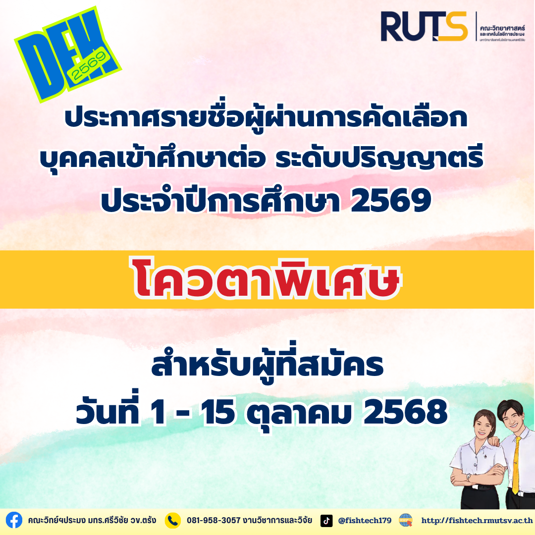 ประกาศรายชื่อผู้ผ่านการคัดเลือกเข้าศึกษาต่อระดับปริญญาตรี แบบโควตาพิเศษ ประจำปีการศึกษา 2569 ระหว่างวันที่ 1 – 15 ตุลาคม 2568 ขั้นตอนต่อไปสำหรับผู้ที่มีรายชื่อ