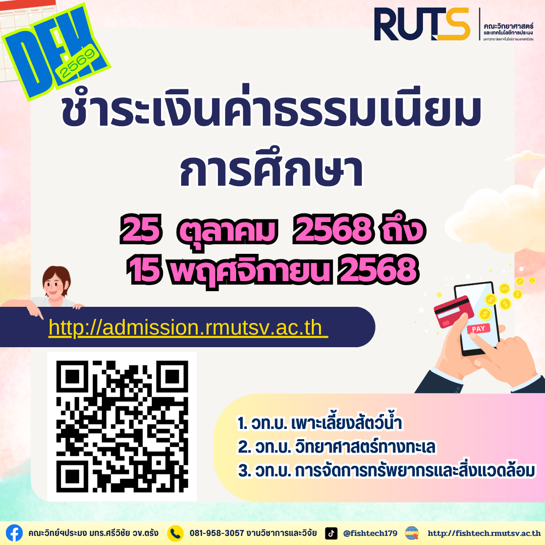 15 พฤศจิกายน 2568 พิมพ์ใบแจ้งยอดการชำระเงินค่าธรรมเนียมการศึกษาทางเว็บไซต์ http://admission.rmutsv.ac.th และชำระเงินค่าธรรมเนียมการศึกษาผ่านแอพพลิเคชั่นทุกธนาคาร หรือเคาน์เตอร์ธนาคารกรุงไทย - ผู้ที่ไม่ได้ปฏิบัติตามขั้นตอนและกำหนดการของคณะฯ จะถือว่าสละสิทธิ์ในการเข้าศึกษาต่อ