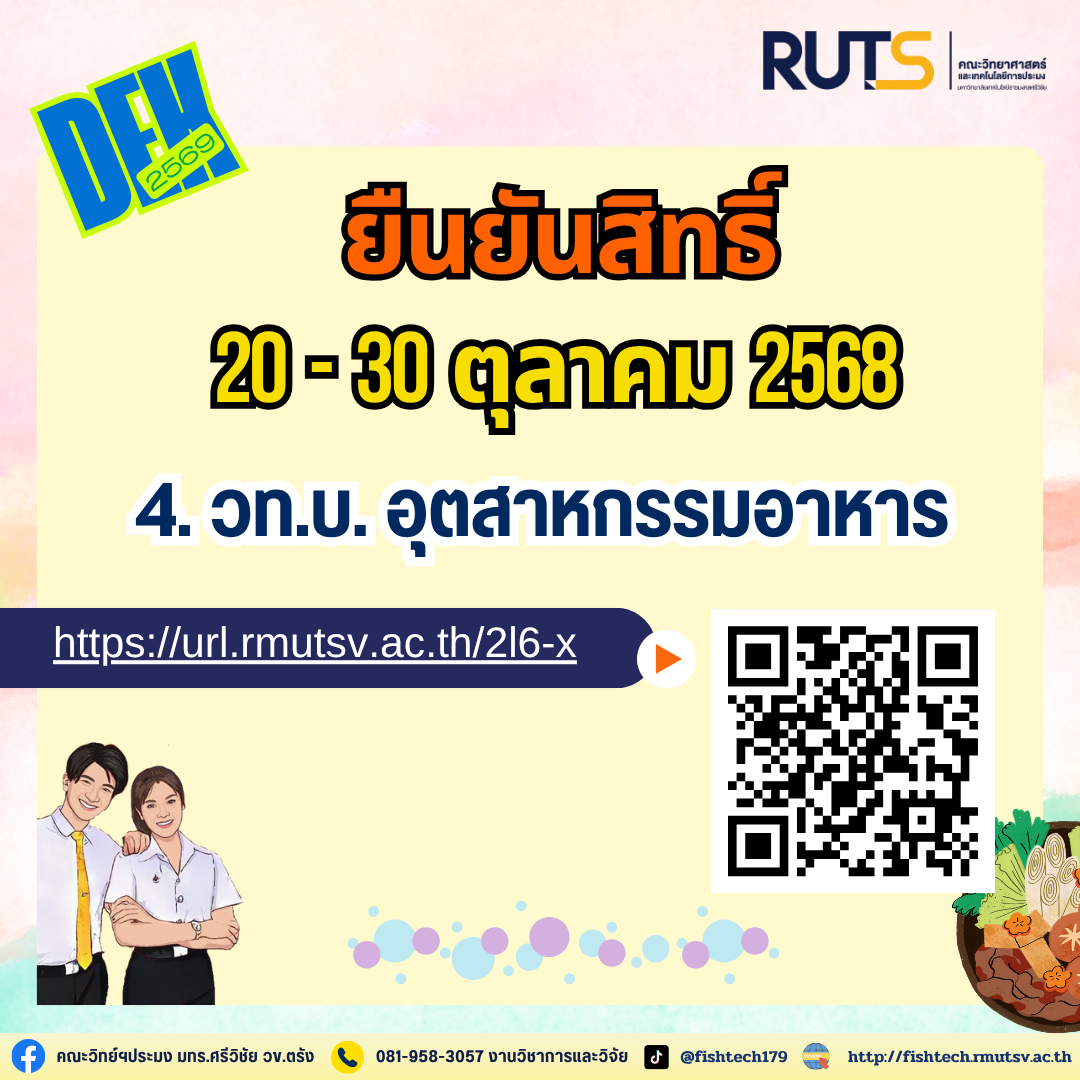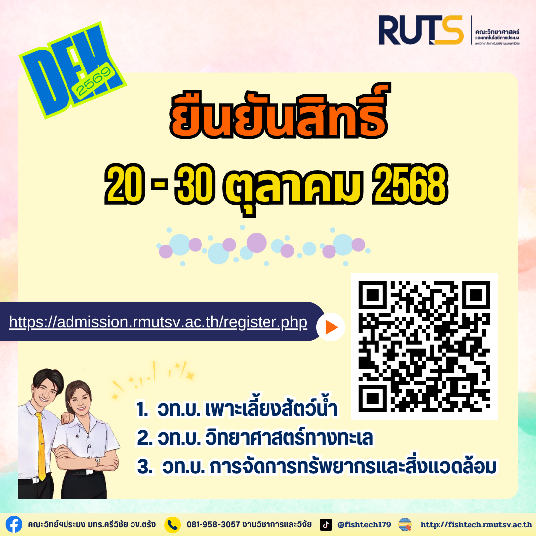 ทางเว็บไซต์ที่ https://trang.rmutsv.ac.th/regis2/admission/index.php - ผู้ที่ดำเนินการยืนยันสิทธิ์เข้าศึกษาต่อ ระหว่างวันที่ 25 ตุลาคม 2568 ถึง