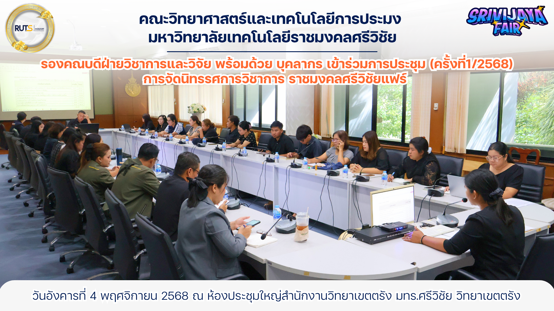 ดร.นัทธ์หทัย เครบส์ รองคณบดีฝ่ายวิชาการและวิจัย พร้อมด้วยบุคลากรคณะวิทยาศาสตร์และเทคโนโลยีการประมง เข้าร่วมประชุมเตรียมความพร้อมการจัดนิทรรศการวิชาการ ราชมงคลศรีวิชัยแฟร์ ซึ่งจะจัดขึ้นระหว่างวันที่ 27 – 28 พฤศจิกายน 2568 ณ มหาวิทยาลัยเทคโนโลยีราชมงคลศรีวิชัย วิทยาเขตตรัง