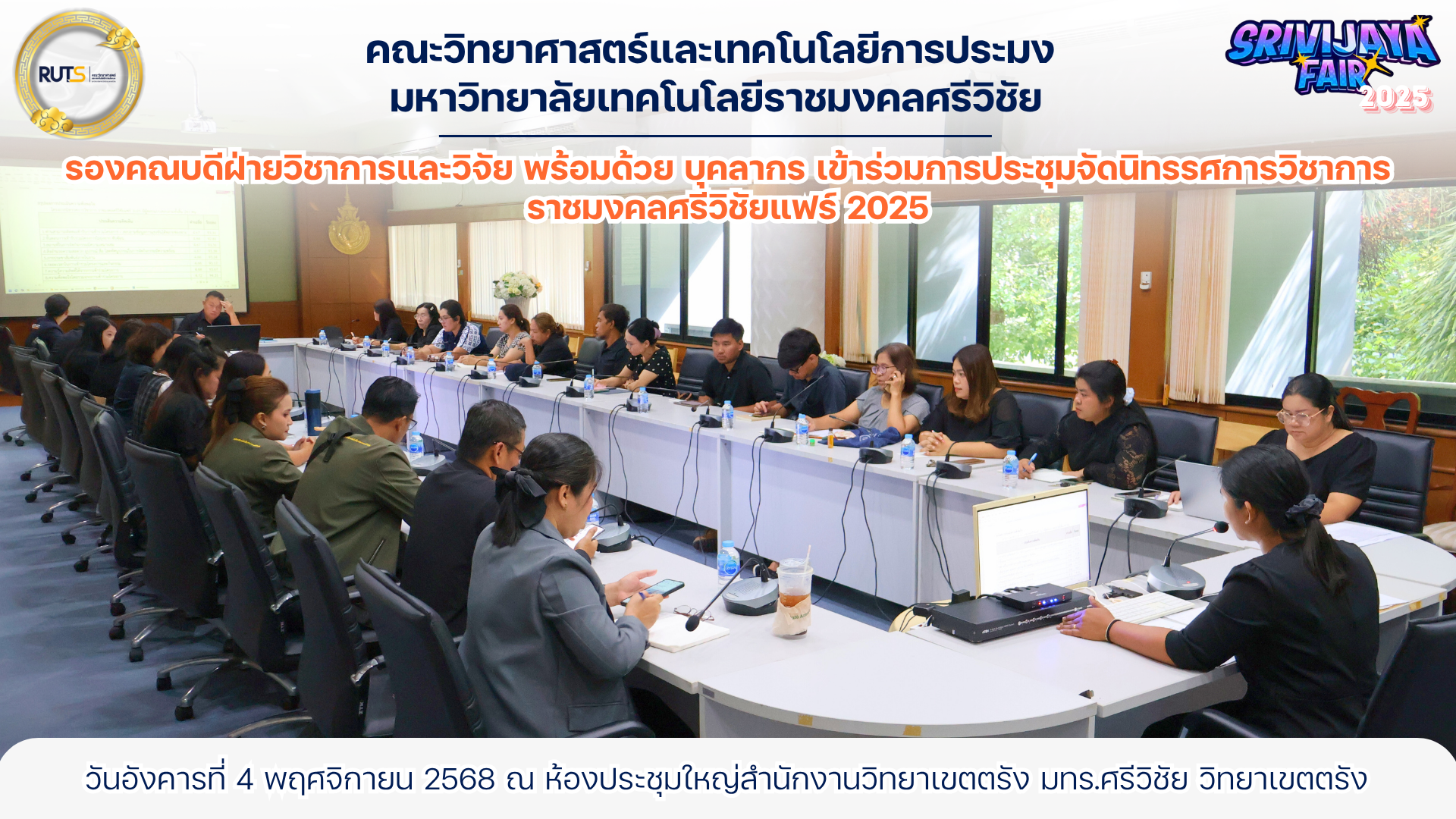 ดร.นัทธ์หทัย เครบส์ รองคณบดีฝ่ายวิชาการและวิจัย พร้อมด้วยบุคลากรคณะวิทยาศาสตร์และเทคโนโลยีการประมง เข้าร่วมประชุมเตรียมความพร้อมการจัดนิทรรศการวิชาการ “ราชมงคลศรีวิชัยแฟร์ 2025” ซึ่งจะจัดขึ้นระหว่างวันที่ 27 – 28 พฤศจิกายน 2568 ณ มหาวิทยาลัยเทคโนโลยีราชมงคลศรีวิชัย วิทยาเขตตรัง