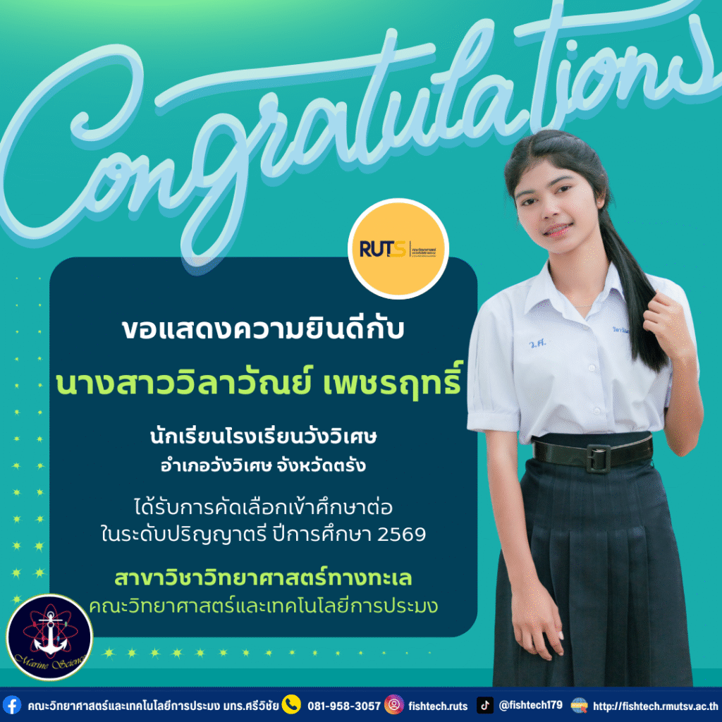 คณะวิทยาศาสตร์และเทคโนโลยีการประมง ยินดีต้อนรับและขอแสดงความยินดี กับ นางสาววิลาวัณย์ เพชรฤทธิ์ นักเรียนโรงเรียนวังวิเศษ อำเภอวังวิเศษ จังหวัด ตรังผ่านการคัดเลือกเข้าศึกษาต่อระดับปริญญาตรี ปีการศึกษา 2569 ในสาขาวิชาวิทยาศาสตร์ทางทะเล คณะวิทยาศาสตร์และเทคโนโลยีการประมง มหาวิทยาลัยเทคโนโลยีราชมงคลศรีวิชัย วิทยาเขตตรัง