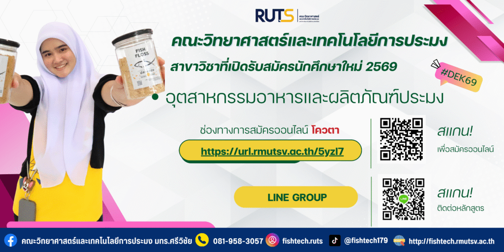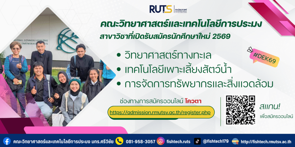ปลาในน้ำยังมีฟอง แล้วน้องๆ พร้อมสมัครยังน้า #คณะวิทยาศาสตร์และเทคโนโลยีการประมง มทร.ศรีวิชัย เปิดรับสมัครนักศึกษาใหม่ ระดับปริญญาตรี (4 ปี) ประจำปีการศึกษา 2569 สำหรับน้อง ๆ ม.6 หรือเทียบเท่า (ทุกแผนการเรียน) ใน 4 สาขาวิชา ที่เปิดรับโควตาพิเศษ ดังนี้