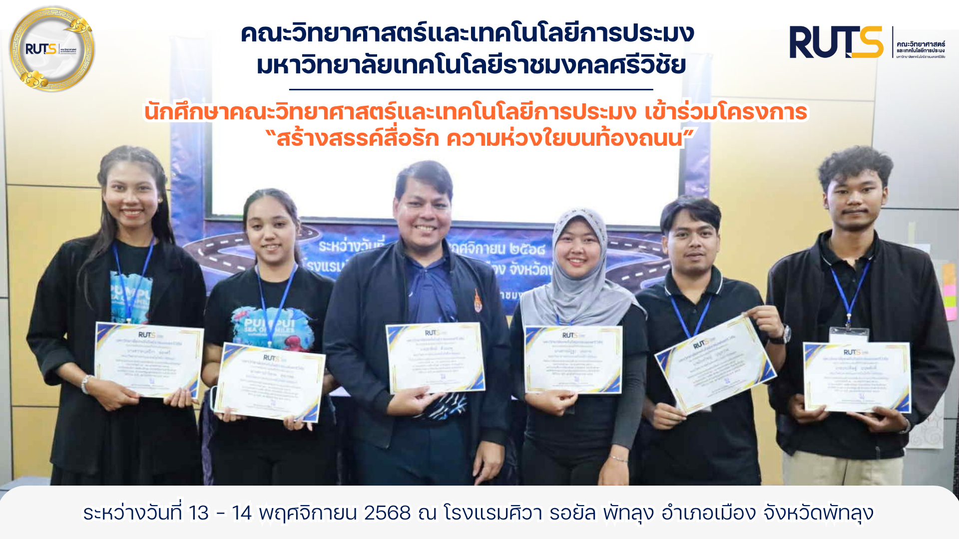 นายอาทิตย์ ด้วนเกตุ นักวิชาการศึกษา ได้รับมอบหมายจาก นายนฤทธิ์ กล่อมพงษ์ รองคณบดีฝ่ายพัฒนานักศึกษา ตัวแทนสโมสรนักศึกษาคณะวิทยาศาสตร์และเทคโนโลยีการประมง เข้าร่วม โครงการสร้างสรรค์สื่อรัก ความห่วงใยบนท้องถนน ระหว่างวันที่ 13–14 พฤศจิกายน 2568 ณ โรงแรมศิวา รอยัล พัทลุง อำเภอเมือง จังหวัดพัทลุง