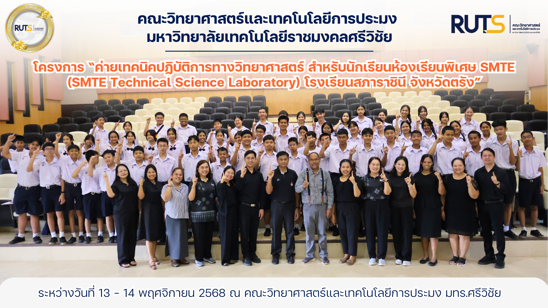 คณะวิทยาศาสตร์และเทคโนโลยีการประมง มหาวิทยาลัยเทคโนโลยีราชมงคลศรีวิชัย วิทยาเขตตรัง จัดโครงการ “ค่ายเทคนิคปฏิบัติการทางวิทยาศาสตร์ สำหรับนักเรียนห้องเรียนพิเศษ SMTE (SMTE Technical Science Laboratory)” ให้กับนักเรียนระดับชั้นมัธยมศึกษาปีที่ 1 และปีที่ 4 จาก โรงเรียนสภาราชินี จังหวัดตรัง จำนวน 60 คน ระหว่างวันที่ 13 – 14 พฤศจิกายน 2568 ณ คณะวิทยาศาสตร์และเทคโนโลยีการประมง มทร.ศรีวิชัย วิทยาเขตตรัง