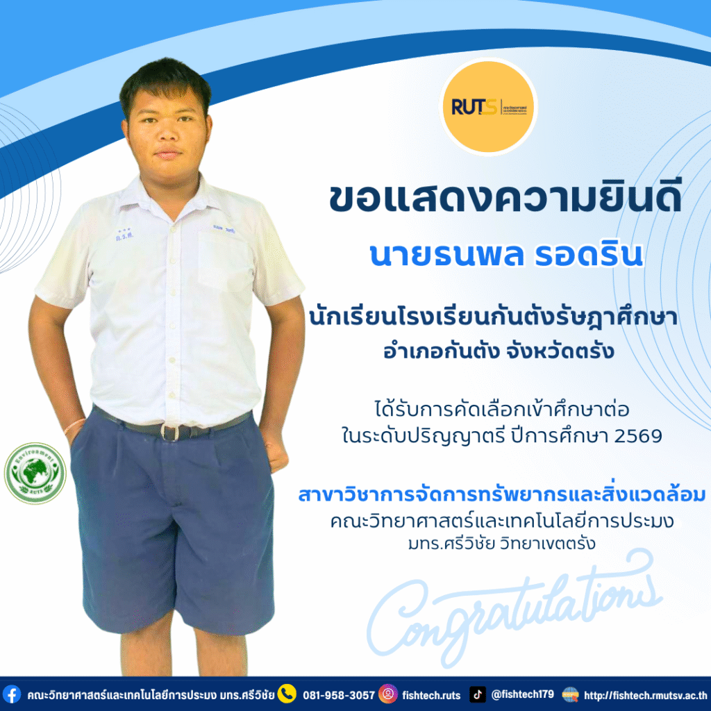 คณะวิทยาศาสตร์และเทคโนโลยีการประมง ยินดีต้อนรับและขอแสดงความยินดี กับ นายธนพล รอดริน นักเรียนโรงเรียนกันตังรัษฎาศึกษา อำเภอกันตัง จังหวัดตรัง ผ่านการคัดเลือกเข้าศึกษาต่อระดับปริญญาตรี ปีการศึกษา 2569 ในสาขาวิชาการจัดการทรัพยากรและสิ่งแวดล้อม คณะวิทยาศาสตร์และเทคโนโลยีการประมง มหาวิทยาลัยเทคโนโลยีราชมงคลศรีวิชัย วิทยาเขตตรัง