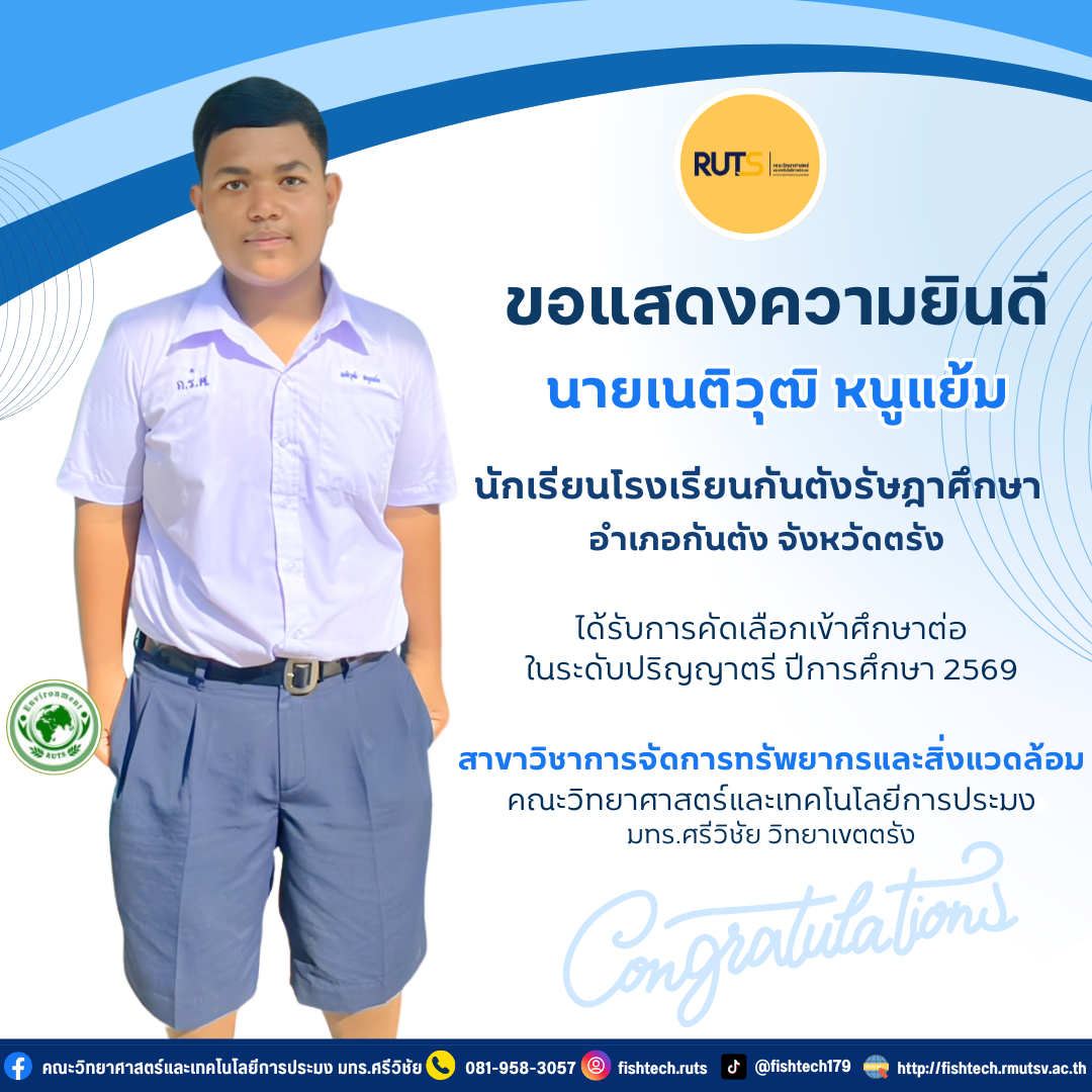 คณะวิทยาศาสตร์และเทคโนโลยีการประมง ยินดีต้อนรับและขอแสดงความยินดี กับ นายเนติวุฒิ หนูแย้ม นักเรียนโรงเรียนกันตังรัษฎาศึกษา อำเภอกันตัง จังหวัดตรัง ผ่านการคัดเลือกเข้าศึกษาต่อระดับปริญญาตรี ปีการศึกษา 2569 ในสาขาวิชาการจัดการทรัพยากรและสิ่งแวดล้อม คณะวิทยาศาสตร์และเทคโนโลยีการประมง มหาวิทยาลัยเทคโนโลยีราชมงคลศรีวิชัย วิทยาเขตตรัง