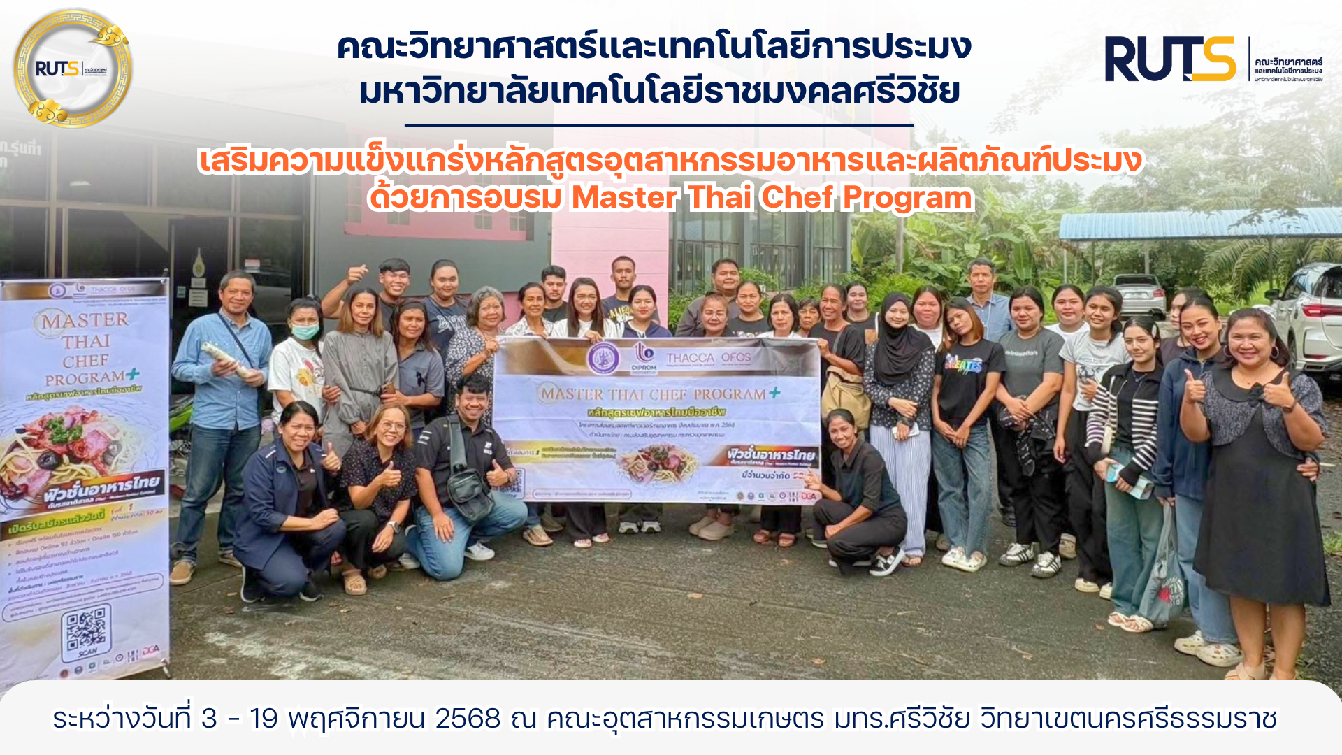 รองศาสตราจารย์ชมพูนุช โสมาลีย์ อาจารย์ประจำหลักสูตรอุตสาหกรรมอาหารและผลิตภัณฑ์ประมง เข้าร่วม โครงการอบรม Master Thai Chef Program หลักสูตร ฟิวชั่นอาหารไทยกับรสชาติสากล (Thai–Western Fusion Cuisine) ระหว่างวันที่ 3 – 19 พฤศจิกายน 2568 ณ คณะอุตสาหกรรมเกษตร มทร.ศรีวิชัย ร่วมกับ วิทยาลัยนวัตกรรมการจัดการ มทร.รัตนโกสินทร์ วิทยาเขตศาลายา