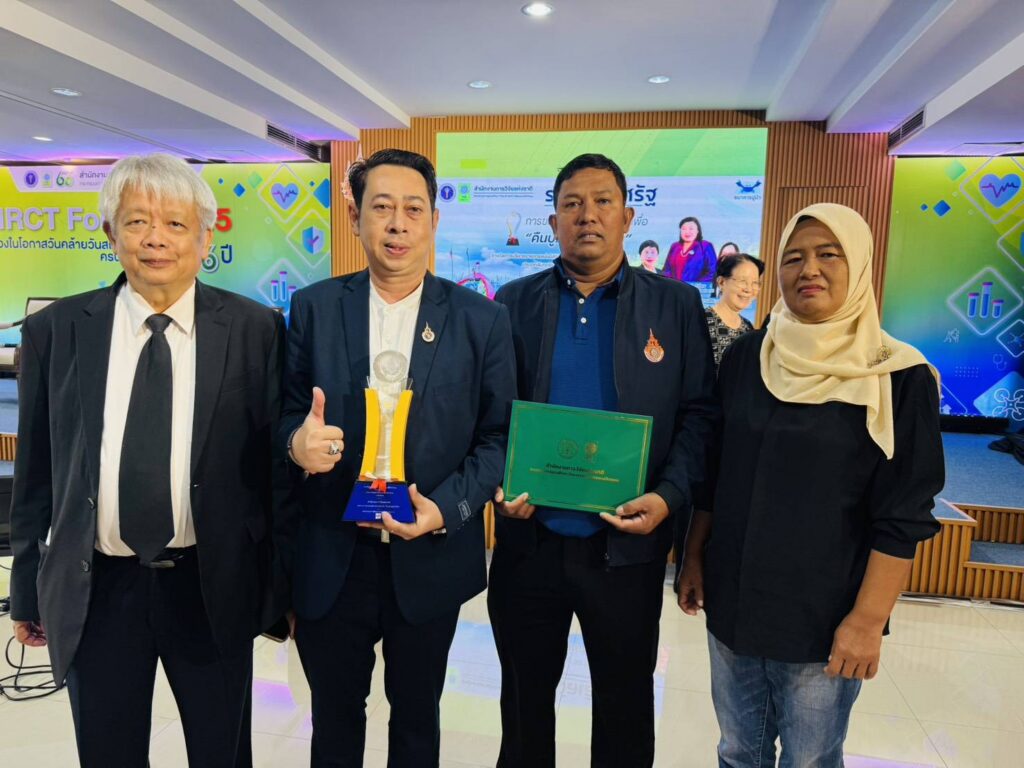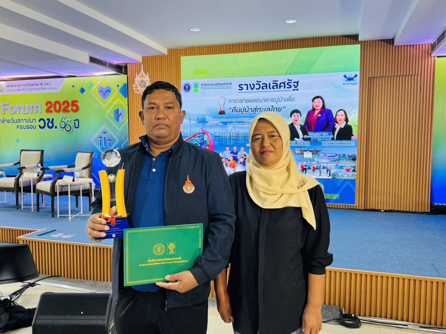 โดยมี ผู้ช่วยศาสตราจารย์ ดร.วิกิจ ผินรับ ผู้ช่วยอธิการบดีประจำวิทยาเขตตรัง หัวหน้าโครงการธนาคารปูม้าตรังกระบี่ และอาจารย์ประจำคณะวิทยาศาสตร์และเทคโนโลยีการประมง เข้ารับโล่รางวัลเลิศรัฐดีเด่นประจำปี 2568 ผู้มีส่วนร่วมดำเนินงานภายใต้โครงการขยายผลธนาคารปูม้าเพื่อ “คืนปูม้าสู่ทะเลไทย”