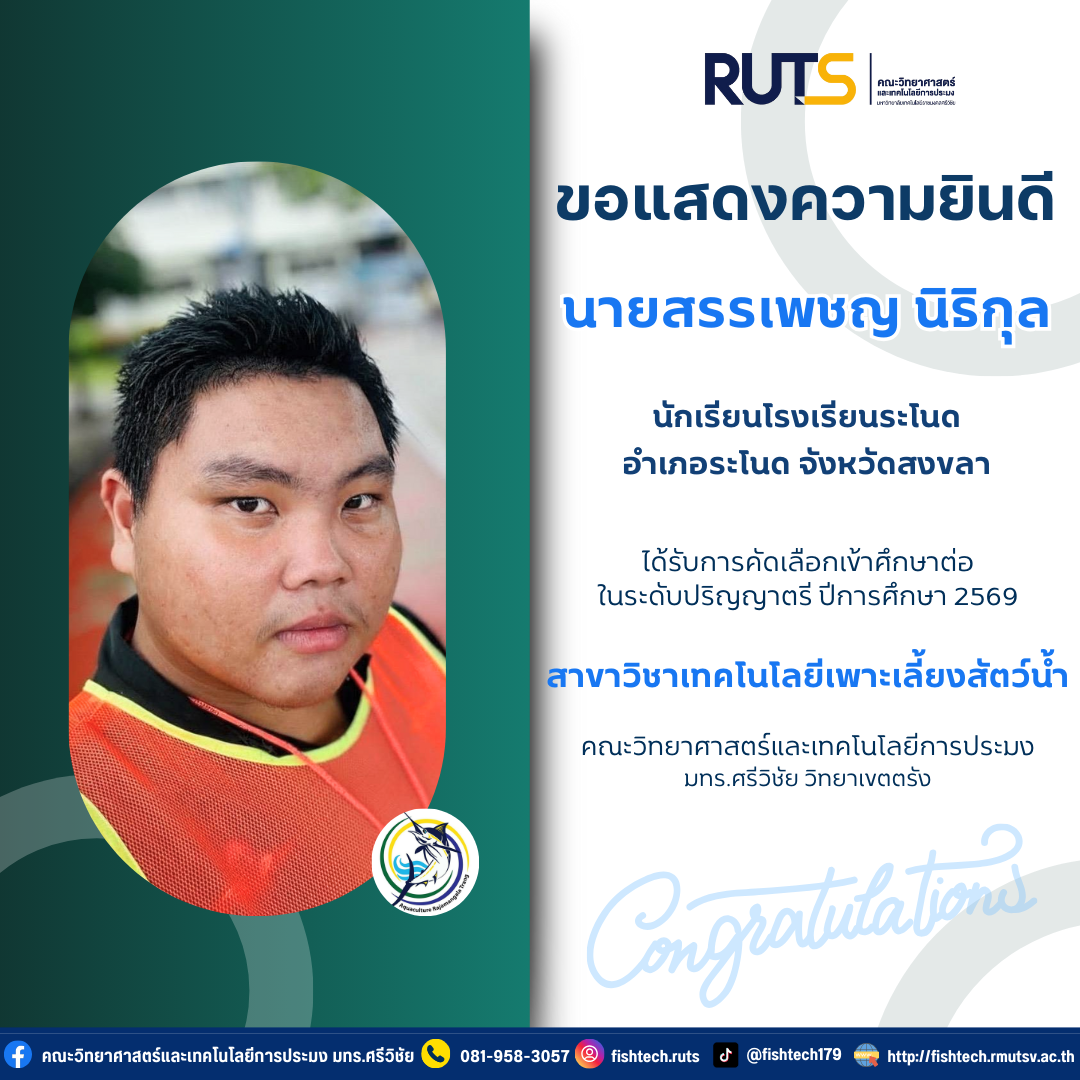 คณะวิทยาศาสตร์และเทคโนโลยีการประมง ยินดีต้อนรับและขอแสดงความยินดี กับ นายสรรเพชญ นิธิกุล นักเรียนโรงเรียนระโนด อำเภอระโนด จังหวัดสงขลา ผ่านการคัดเลือกเข้าศึกษาต่อระดับปริญญาตรี ปีการศึกษา 2569 ในสาขาวิชาเทคโนโลยีเพาะเลี้ยงสัตว์น้ำ คณะวิทยาศาสตร์และเทคโนโลยีการประมง มหาวิทยาลัยเทคโนโลยีราชมงคลศรีวิชัย วิทยาเขตตรัง