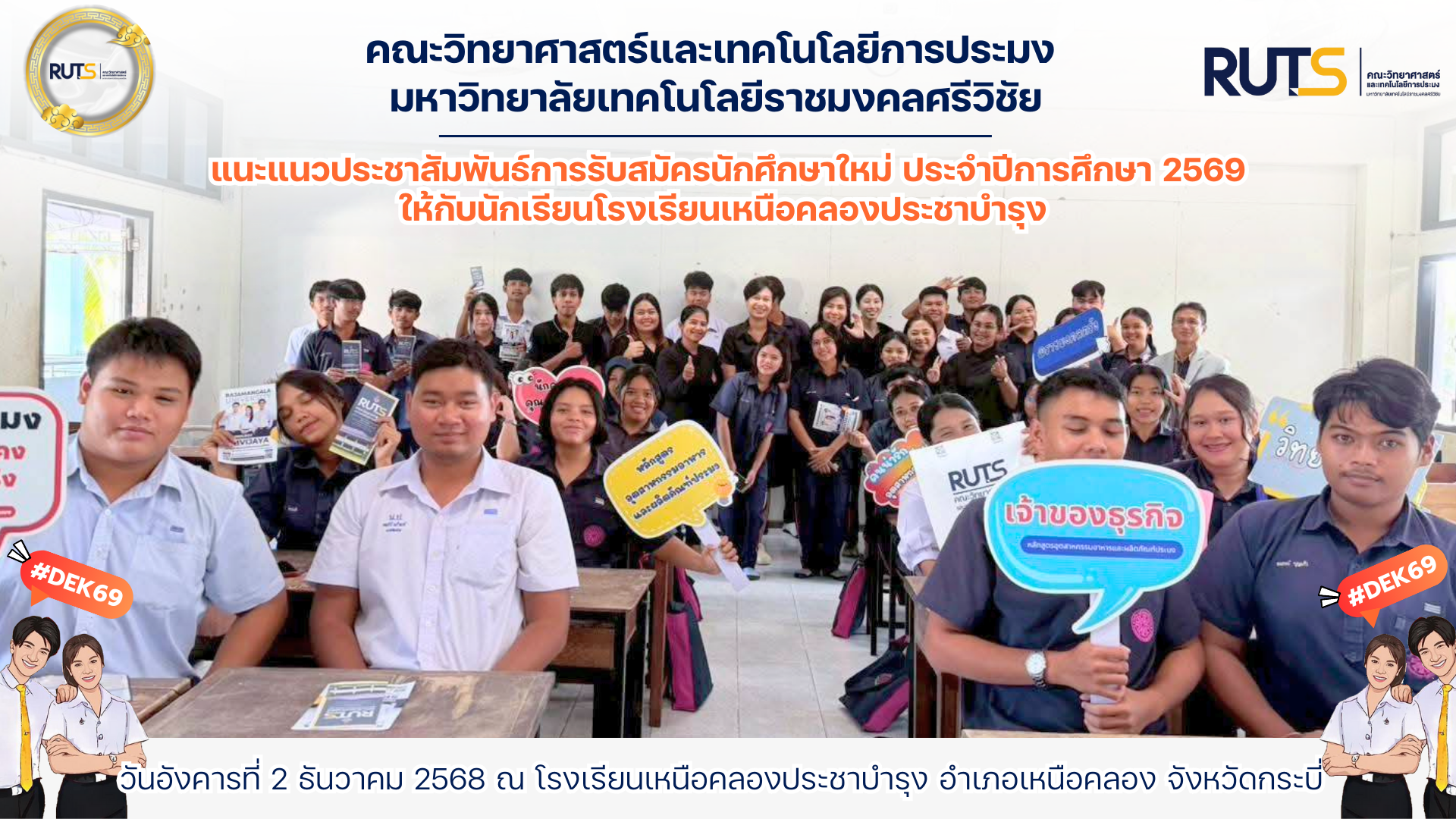 คณาจารย์และบุคลากรคณะวิทยาศาสตร์และเทคโนโลยีการประมง มหาวิทยาลัยเทคโนโลยีราชมงคลศรีวิชัย วิทยาเขตตรัง เข้าแนะแนวการศึกษาต่อ ระดับปริญญาตรี ประจำปีการศึกษา 2569 ให้แก่ นักเรียนโรงเรียนเหนือคลองประชาบำรุง อำเภอเหนือคลอง จังหวัดกระบี่ ในโครงการแนะแนวสัญจร ประจำปีการศึกษา 2569 ในวันอังคารที่ 3 ธันวาคม 2568