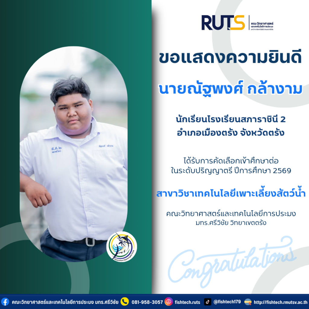 คณะวิทยาศาสตร์และเทคโนโลยีการประมง ยินดีต้อนรับและขอแสดงความยินดี กับ นายณัฐพงศ์ กล้างาม นักเรียนโรงเรียนสภาราชินี 2 อำเภอเมืองตรัง จังหวัดตรัง ผ่านการคัดเลือกเข้าศึกษาต่อระดับปริญญาตรี ปีการศึกษา 2569 ในสาขาวิชาเทคโนโลยีเพาะเลี้ยงสัตว์น้ำ คณะวิทยาศาสตร์และเทคโนโลยีการประมง มหาวิทยาลัยเทคโนโลยีราชมงคลศรีวิชัย วิทยาเขตตรัง