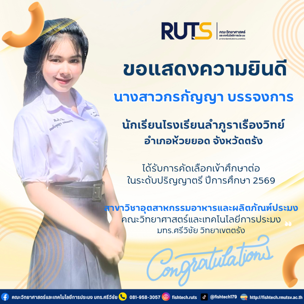 ผ่านการคัดเลือกเข้าศึกษาต่อระดับปริญญาตรี ปีการศึกษา 2569 ในสาขาวิชาอุตสาหกรรมอาหารและผลิตภัณฑ์ประมง คณะวิทยาศาสตร์และเทคโนโลยีการประมง มหาวิทยาลัยเทคโนโลยีราชมงคลศรีวิชัย วิทยาเขตตรัง
