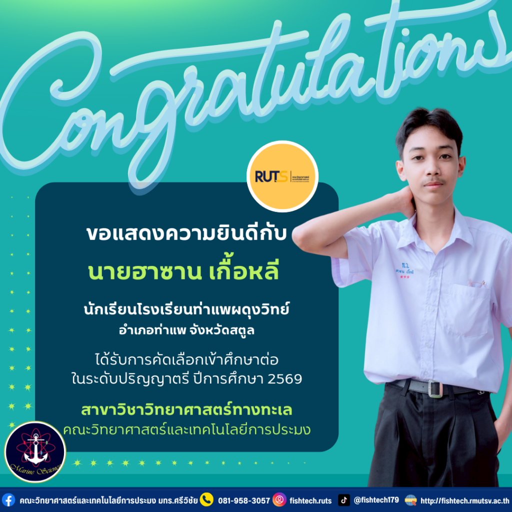 คณะวิทยาศาสตร์และเทคโนโลยีการประมง ยินดีต้อนรับและขอแสดงความยินดี กับ นายฮาซาน เกื้อหลี นักเรียนโรงเรียนท่าแพผดุงวิทย์ อำเภอท่าแพ จังหวัดสตูล ผ่านการคัดเลือกเข้าศึกษาต่อระดับปริญญาตรี ปีการศึกษา 2569 ในสาขาวิชาวิทยาศาสตร์ทางทะเล คณะวิทยาศาสตร์และเทคโนโลยีการประมง มหาวิทยาลัยเทคโนโลยีราชมงคลศรีวิชัย วิทยาเขตตรัง