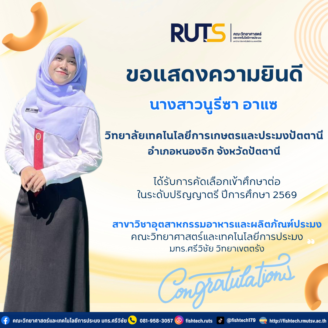 ผ่านการคัดเลือกเข้าศึกษาต่อระดับปริญญาตรี ปีการศึกษา 2569 ในสาขาวิชาอุตสาหกรรมอาหารและผลิตภัณฑ์ประมง คณะวิทยาศาสตร์และเทคโนโลยีการประมง มหาวิทยาลัยเทคโนโลยีราชมงคลศรีวิชัย วิทยาเขตตรัง