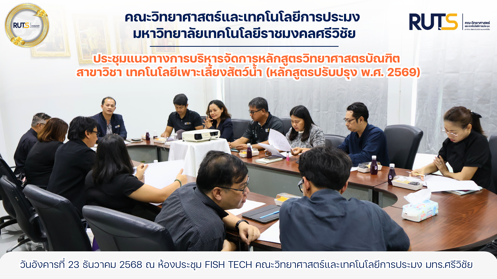 ดร.ภาณุมาศ สุยบางดำ รองอธิการบดีมหาวิทยาลัยเทคโนโลยีราชมงคลศรีวิชัย เป็นประธานในการประชุมแนวทางการบริหารจัดการ หลักสูตรวิทยาศาสตรบัณฑิต สาขาวิชาเทคโนโลยีเพาะเลี้ยงสัตว์น้ำ (หลักสูตรปรับปรุง พ.ศ.2569) ณ ห้องประชุม FISH TECH คณะวิทยาศาสตร์และเทคโนโลยีการประมง มหาวิทยาลัยเทคโนโลยีราชมงคลศรีวิชัย วิทยาเขตตรัง อำเภอสิเกา จังหวัดตรัง ในวันอังคารที่ 23 ธันวาคม 2568