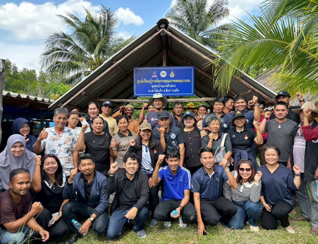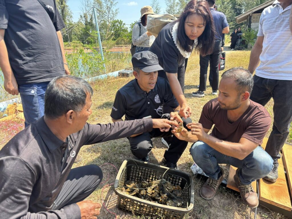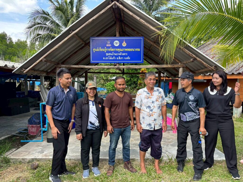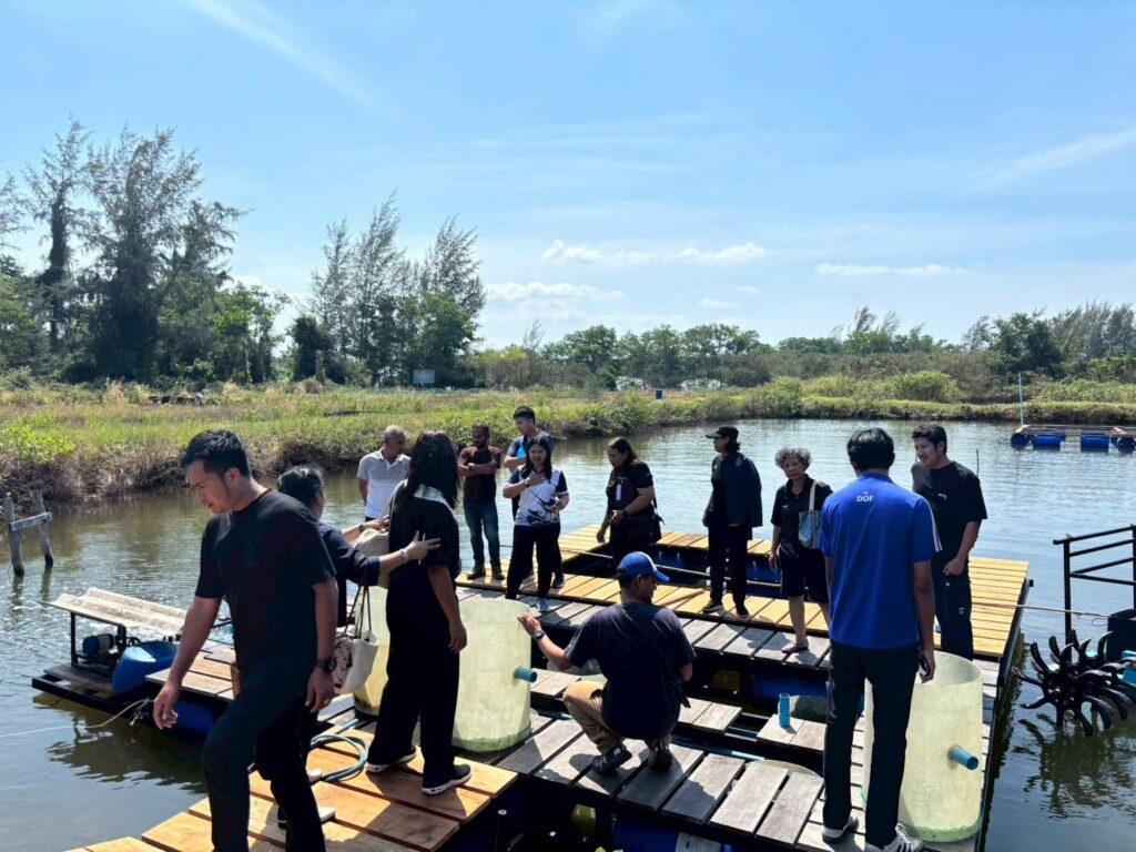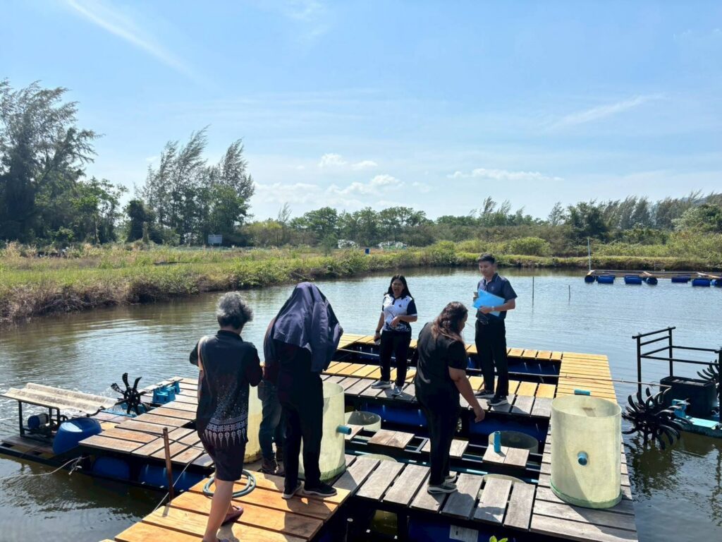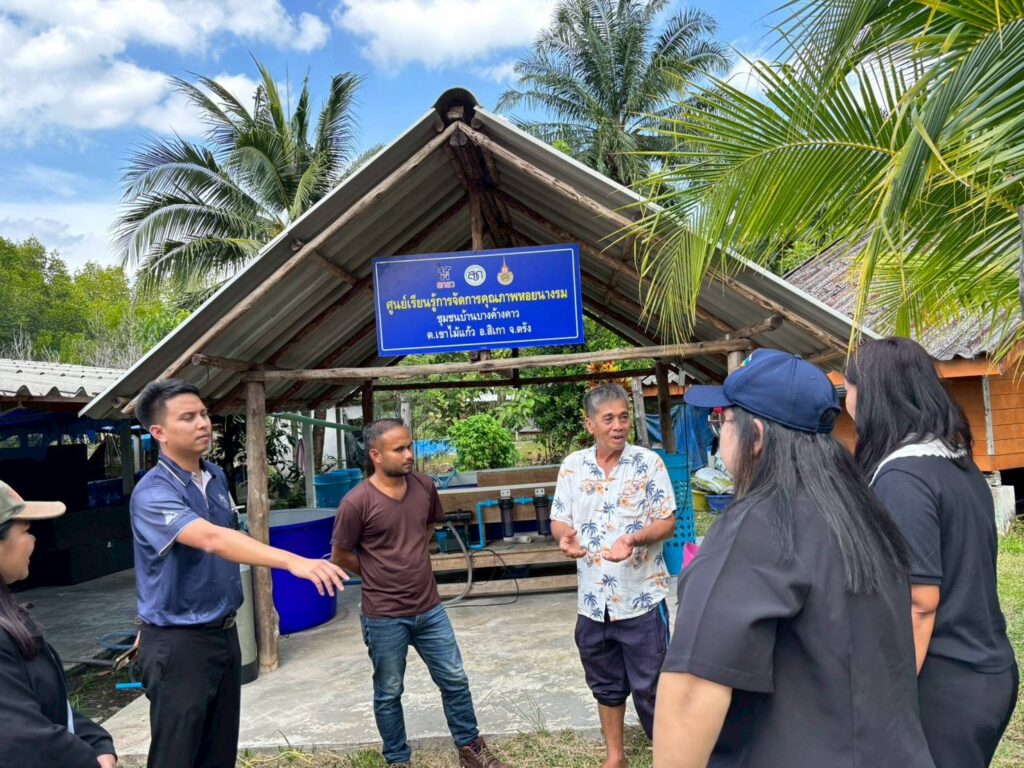 ในช่วงภาคบ่าย มีการพาผู้เข้าร่วมโครงการลงพื้นที่ศึกษาดูงาน ณ ฟาร์มตัวอย่างบ้านบางค้างคาว โดยได้รับความอนุเคราะห์จาก นายมานิต ภักดีย่อง และสมาชิกเกษตรกรผู้เลี้ยงหอยนางรม อำเภอสิเกา จังหวัดตรัง ร่วมถ่ายทอดประสบการณ์จริงด้านการบริหารจัดการฟาร์ม การลดต้นทุน และการเพิ่มผลผลิตจากเกษตรกรต้นแบบ