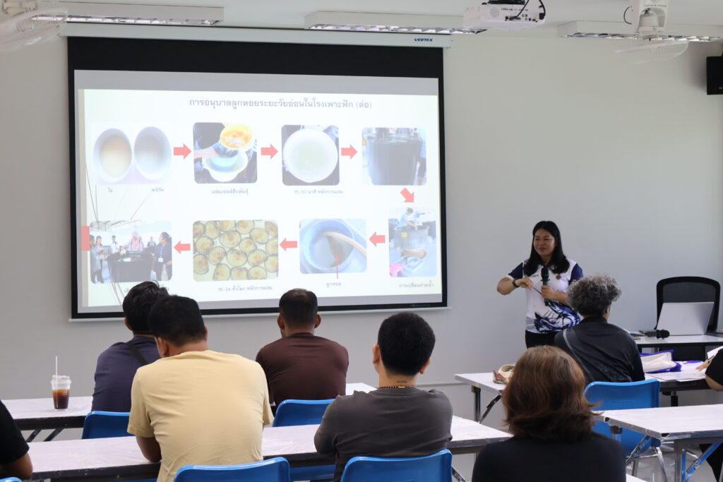 ภายในกิจกรรม ได้รับเกียรติจาก ผู้ช่วยศาสตราจารย์ ดร.สุพัชชา ชูเสียงแจ้ว อาจารย์ประจำสาขาวิชาเทคโนโลยีเพาะเลี้ยงสัตว์น้ำ เป็นวิทยากรถ่ายทอดองค์ความรู้ด้านการจัดการฟาร์ม การลดต้นทุน และการเพิ่มประสิทธิภาพผลผลิต ให้แก่ผู้เข้าร่วมอบรมจาก กลุ่มเกษตรกรแปลงใหญ่หอยนางรม อำเภอท่าฉาง จังหวัดสุราษฎร์ธานี พร้อมทั้งมีกิจกรรมภาคทฤษฎีและการแลกเปลี่ยนประสบการณ์ร่วมกันอย่างใกล้ชิด