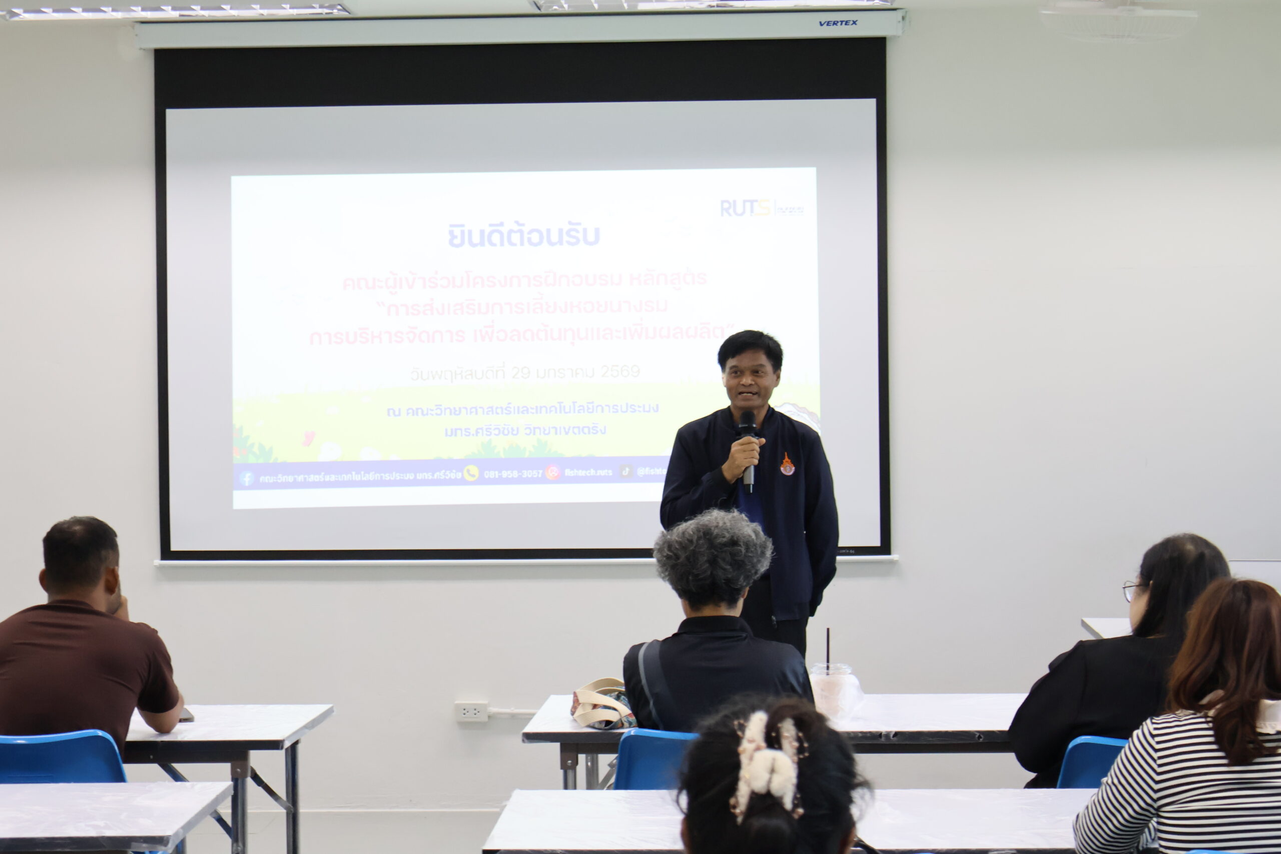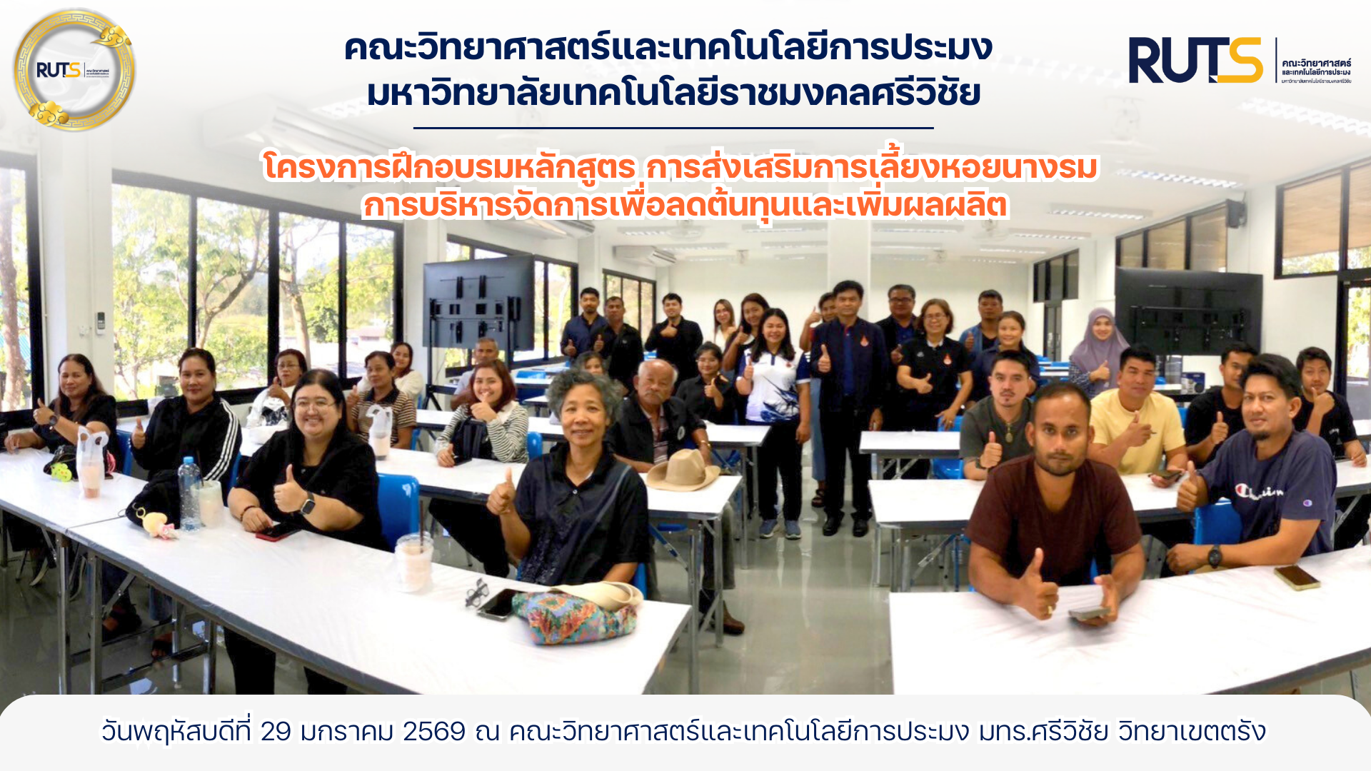 คณะวิทยาศาสตร์และเทคโนโลยีการประมง มหาวิทยาลัยเทคโนโลยีราชมงคลศรีวิชัย จัดกิจกรรมโครงการฝึกอบรม หลักสูตร “การส่งเสริมการเลี้ยงหอยนางรม การบริหารจัดการเพื่อลดต้นทุนและเพิ่มผลผลิต” ร่วมกับ ศูนย์วิจัยและพัฒนาการเพาะเลี้ยงสัตว์น้ำชายฝั่งสุราษฎร์ธานี และ สำนักงานประมงจังหวัดสุราษฎร์ธานี เมื่อวันที่ 29 มกราคม 2569 ณ คณะวิทยาศาสตร์และเทคโนโลยีการประมง มทร.ศรีวิชัย วิทยาเขตตรัง