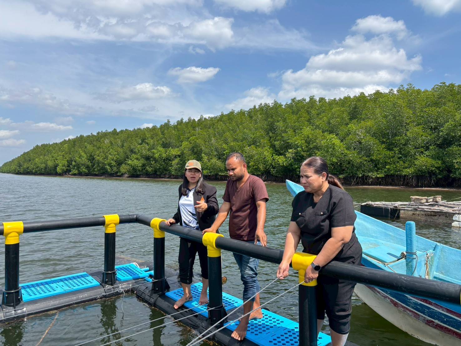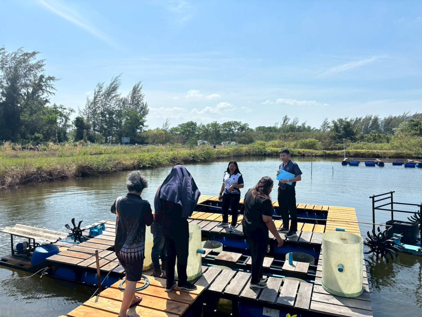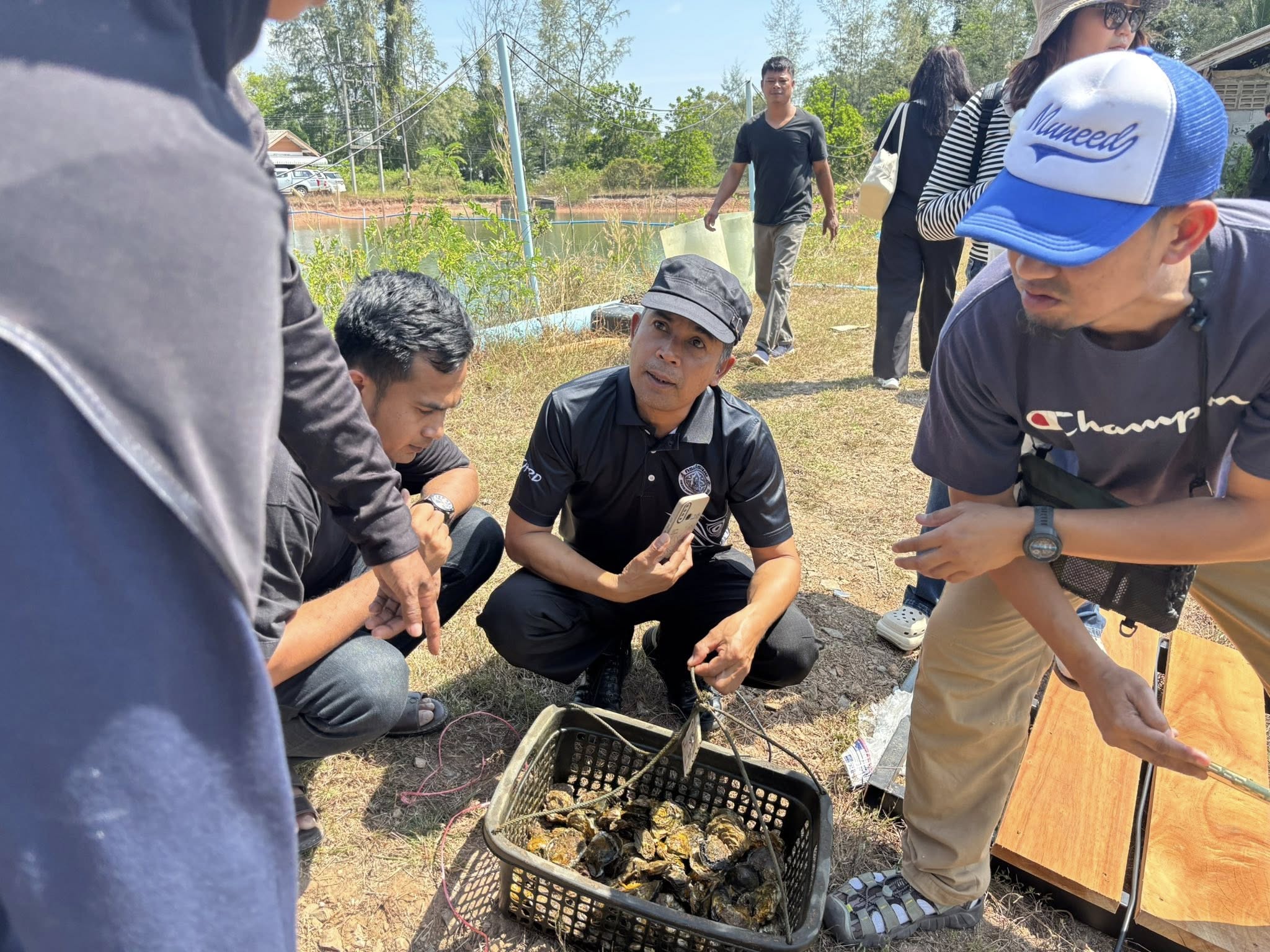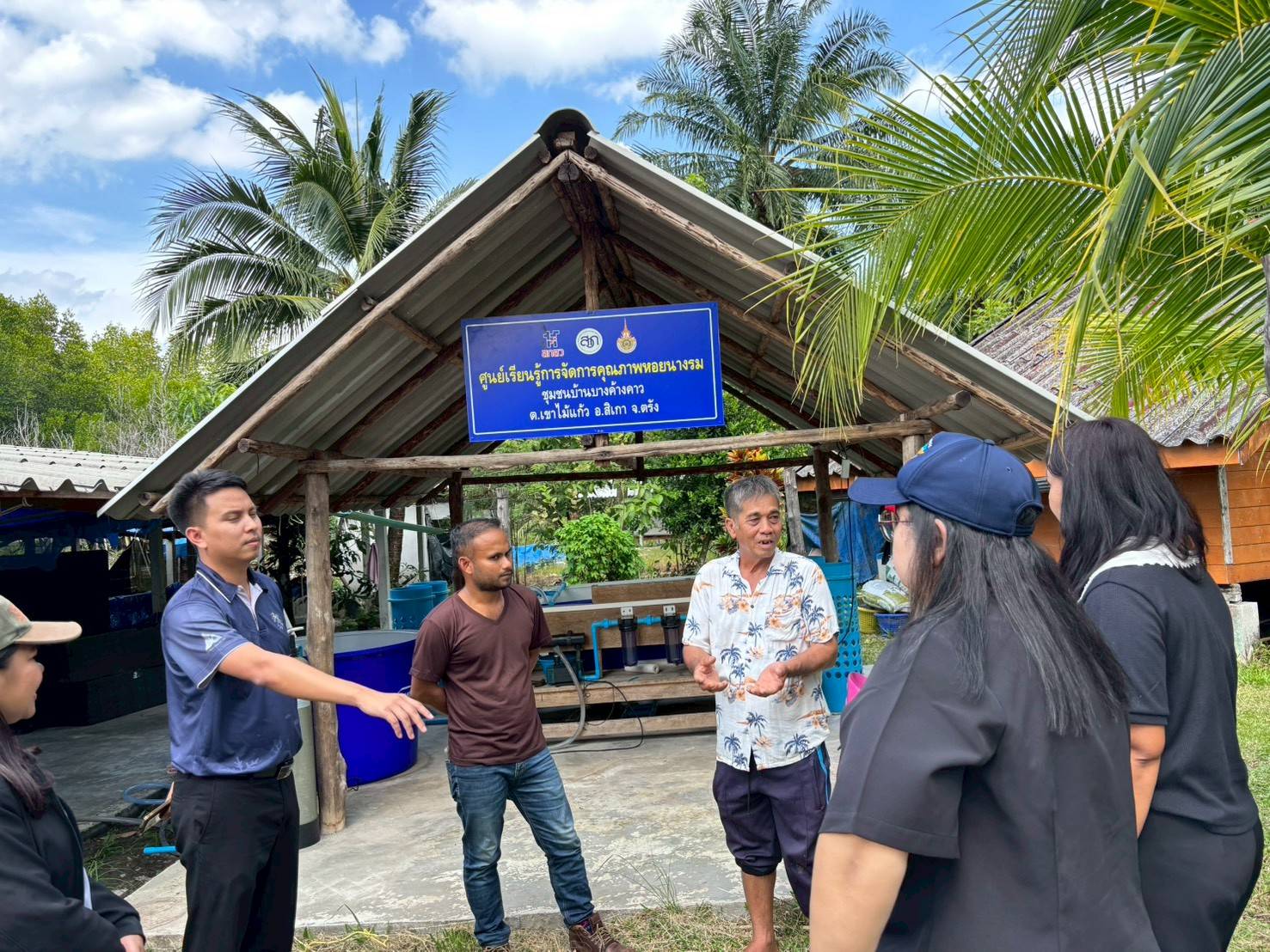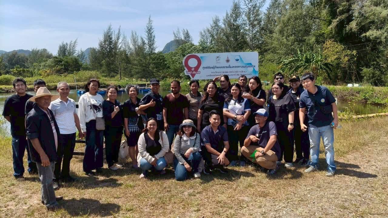 ในช่วงภาคบ่าย มีการพาผู้เข้าร่วมโครงการลงพื้นที่ศึกษาดูงาน ณ ฟาร์มตัวอย่างบ้านบางค้างคาว โดยได้รับความอนุเคราะห์จาก นายมานิต ภักดีย่อง และสมาชิกเกษตรกรผู้เลี้ยงหอยนางรม อำเภอสิเกา จังหวัดตรัง ร่วมถ่ายทอดประสบการณ์จริงด้านการบริหารจัดการฟาร์ม การลดต้นทุน และการเพิ่มผลผลิตจากเกษตรกรต้นแบบ