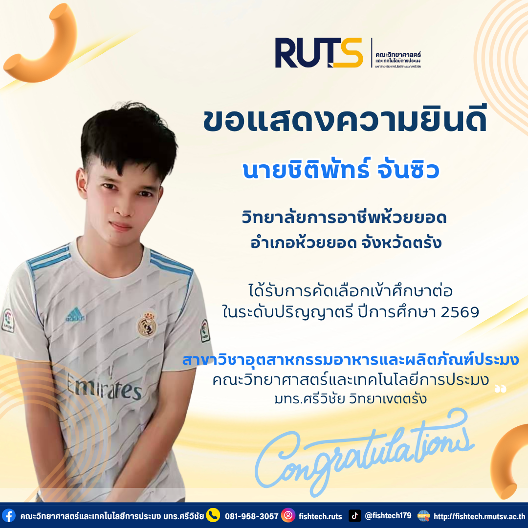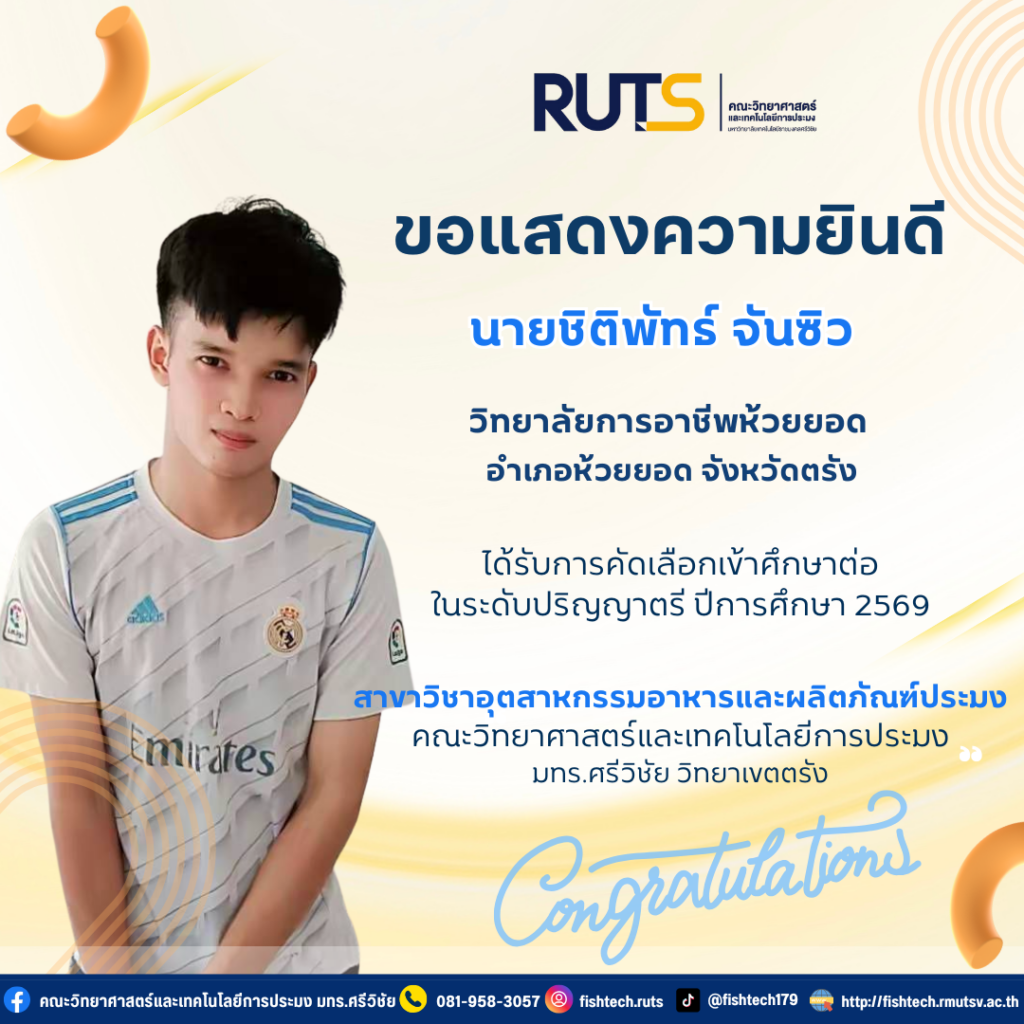 ผ่านการคัดเลือกเข้าศึกษาต่อระดับปริญญาตรี ปีการศึกษา 2569 ในสาขาวิชาอุตสาหกรรมอาหารและผลิตภัณฑ์ประมง คณะวิทยาศาสตร์และเทคโนโลยีการประมง มหาวิทยาลัยเทคโนโลยีราชมงคลศรีวิชัย วิทยาเขตตรัง