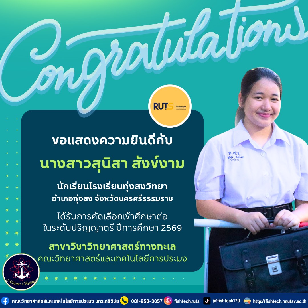 คณะวิทยาศาสตร์และเทคโนโลยีการประมง ยินดีต้อนรับและขอแสดงความยินดี กับ นางสาวสุนิสา สังข์งาม โรงเรียนทุ่งสงวิทยา อำเภอทุ่งสง จังหวัดนครศรีธรรมราช ผ่านการคัดเลือกเข้าศึกษาต่อระดับปริญญาตรี ปีการศึกษา 2569