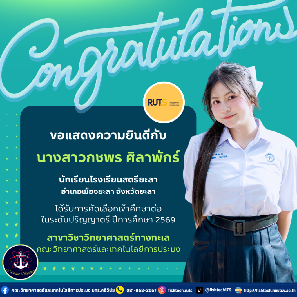คณะวิทยาศาสตร์และเทคโนโลยีการประมง ยินดีต้อนรับและขอแสดงความยินดี กับ นางสาวกชพร ศิลาพักร์ โรงเรียนสตรียะลา อำเภอเมืองยะลา จังหวัดยะลา ผ่านการคัดเลือกเข้าศึกษาต่อระดับปริญญาตรี ปีการศึกษา 2569 ในสาขาวิชาวิทยาศาสตร์ทางทะเล