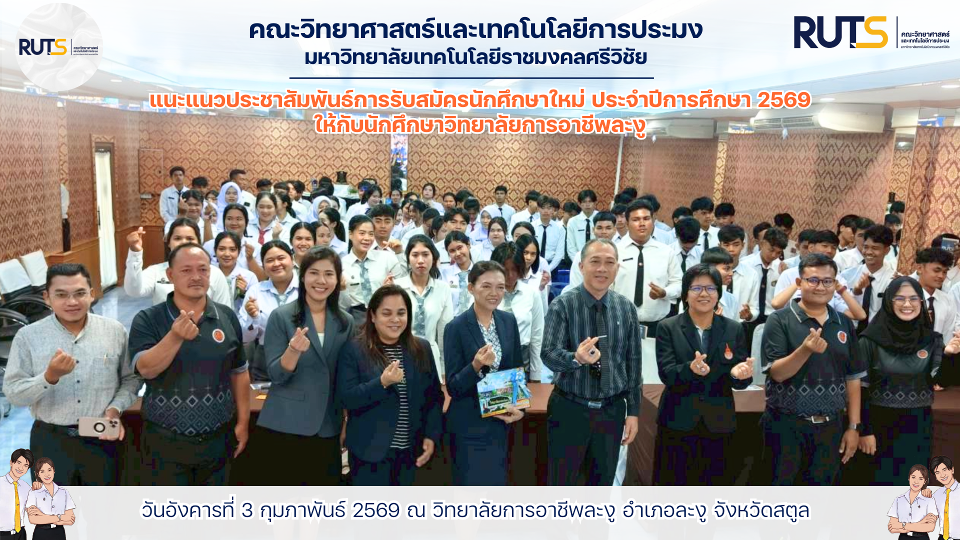 เข้าแนะแนวการศึกษาต่อในระดับปริญญาตรี ประจำปีการศึกษา 2569 ให้แก่นักศึกษาวิทยาลัยการอาชีพละงู ในโครงการแนะแนวสัญจร ประจำปีการศึกษา 2569 ในวันอังคารที่ 3 กุมภาพันธ์ 2569 ณ วิทยาลัยการอาชีพละงู อำเภอละงู จังหวัดสตูล