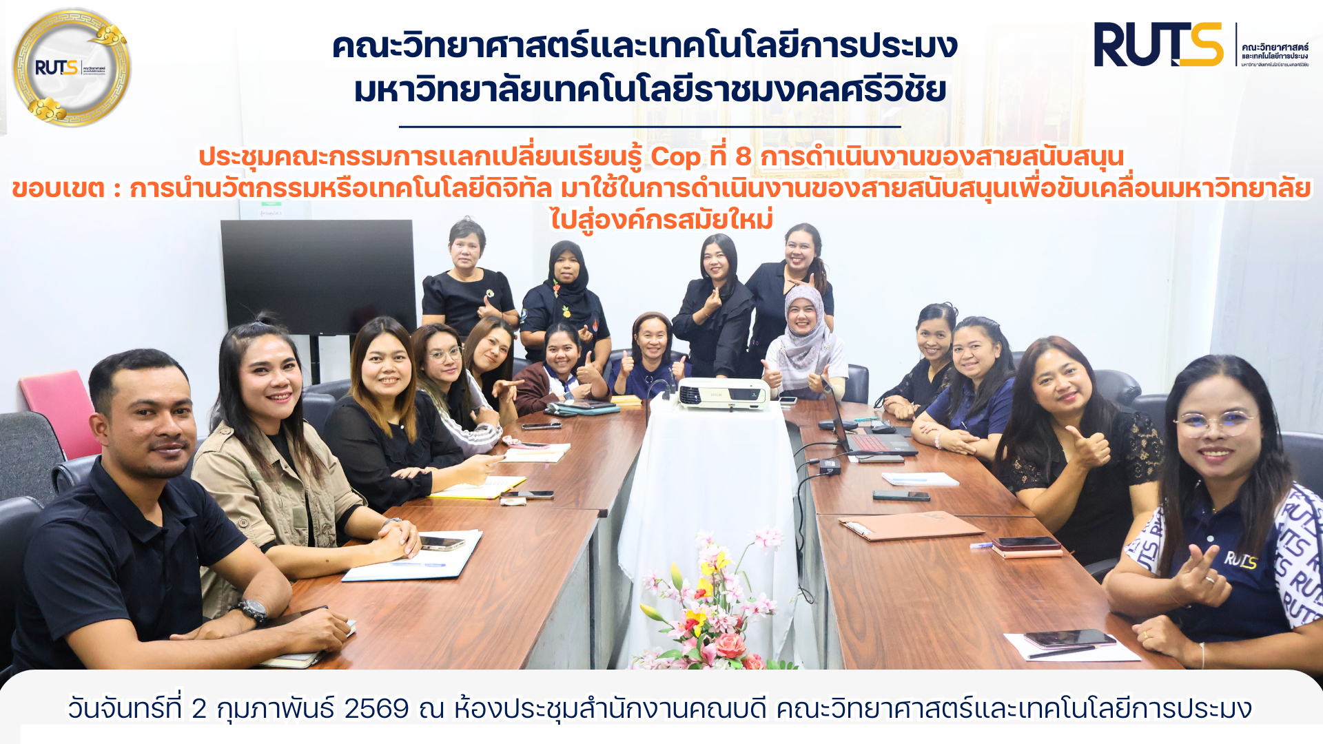 การประชุมจัดขึ้นเมื่อวันพุธที่ 28 มกราคม พ.ศ. 2569 เพื่อร่วมกันวางแผน กำหนดแนวทาง และประเด็นในการแลกเปลี่ยนเรียนรู้ โดยมุ่งเน้นการพัฒนาประสิทธิภาพการทำงานของบุคลากรสายสนับสนุนผ่านการประยุกต์ใช้เทคโนโลยีดิจิทัล