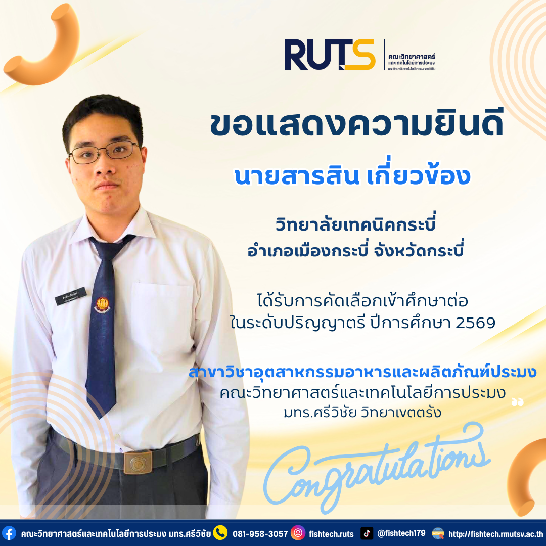 คณะวิทยาศาสตร์และเทคโนโลยีการประมง ยินดีต้อนรับและขอแสดงความยินดี กับ นายสารสิน เกี่ยวข้อง นักศึกษาวิทยาลัยเทคนิคกระบี่ อำเภอเมืองกระบี่ จังหวัดกระบี่