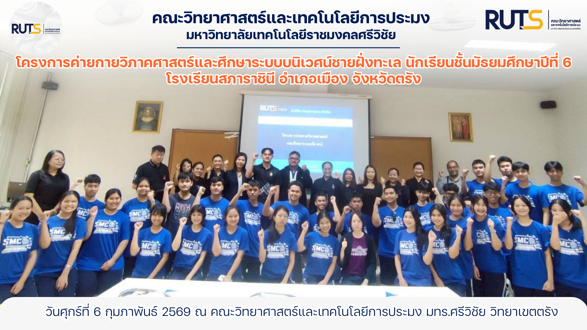 คณะวิทยาศาสตร์และเทคโนโลยีการประมง มหาวิทยาลัยเทคโนโลยีราชมงคลศรีวิชัย วิทยาเขตตรัง เปิดบ้านต้อนรับคณะครูและนักเรียนระดับชั้นมัธยมศึกษาปีที่ 6 จากโรงเรียนสภาราชินี จังหวัดตรัง เข้าร่วมโครงการ ค่ายกายวิภาคศาสตร์และศึกษาระบบนิเวศน์ชายฝั่งทะเล เมื่อวันพุธที่ 6 กุมภาพันธ์ 2569 ณ คณะวิทยาศาสตร์และเทคโนโลยีการประมง