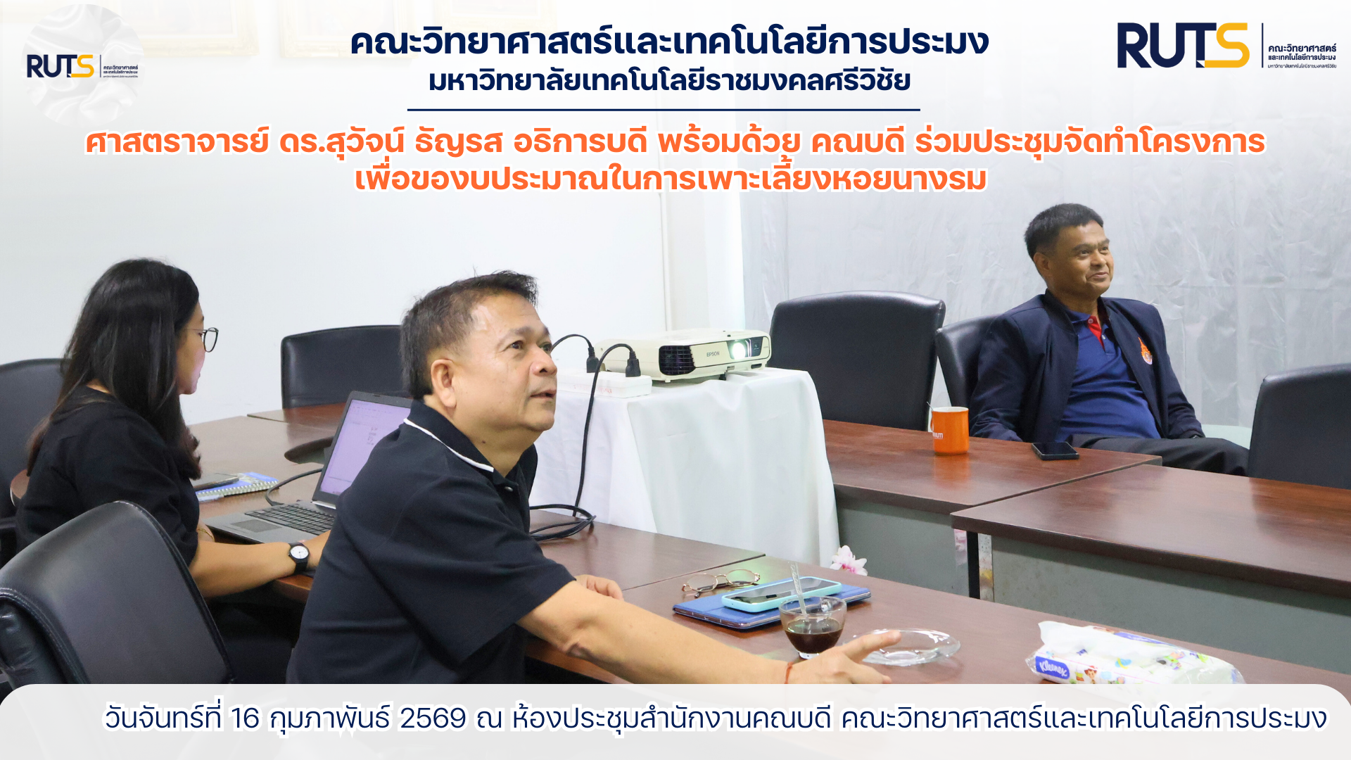 การประชุมจัดขึ้นเมื่อวันจันทร์ที่ 16 กุมภาพันธ์ 2569 ณ ห้องประชุมสำนักงานคณบดี คณะวิทยาศาสตร์และเทคโนโลยีการประมง มทร.ศรีวิชัย วิทยาเขตตรัง โดยมีวัตถุประสงค์เพื่อวางแผนและพัฒนาโครงการให้สอดคล้องกับแนวทางการส่งเสริมงานวิจัยและการพัฒนาด้านการเพาะเลี้ยงสัตว์น้ำอย่างยั่งยืน