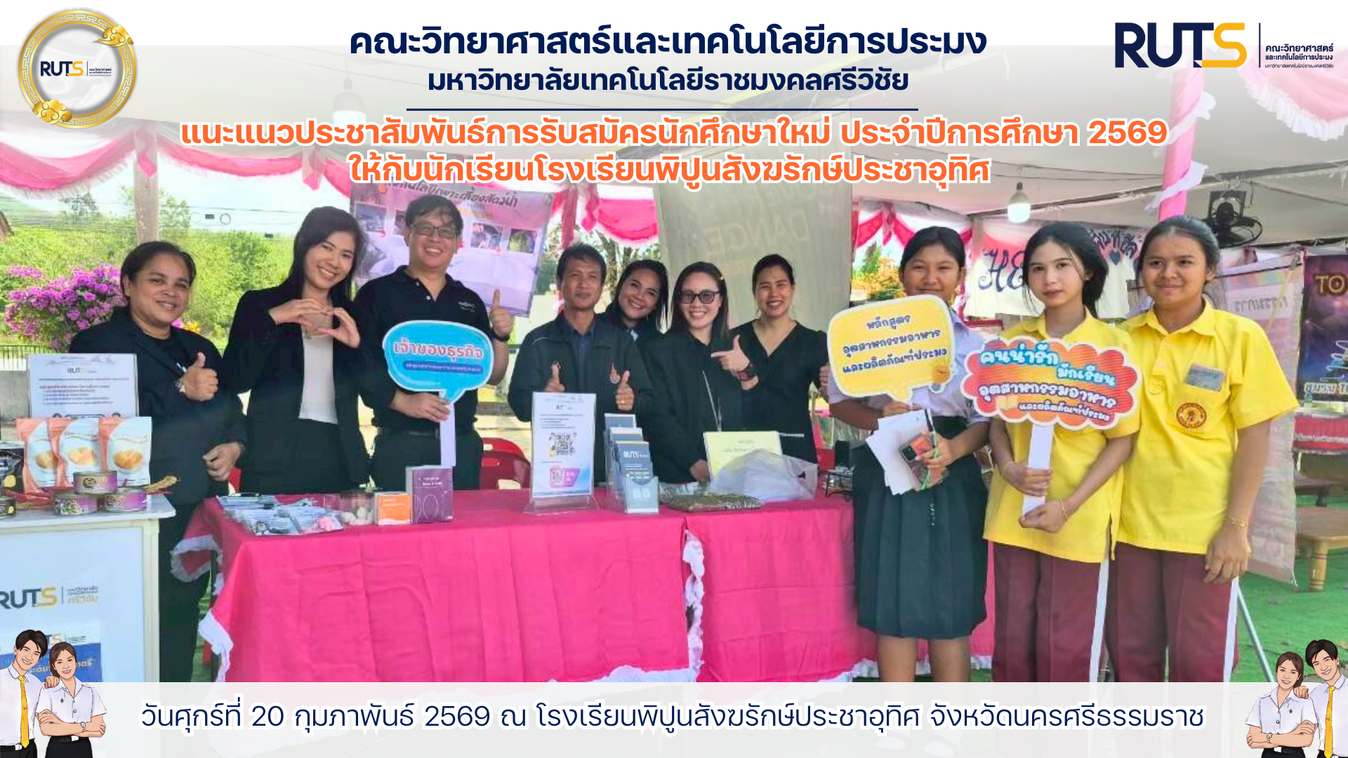 ร่วมจัดนิทรรศการแนะแนวการศึกษาต่อในงาน Open House ณ โรงเรียนพิปูนสังฆรักษ์ประชาอุทิศ จังหวัดนครศรีธรรมราช เพื่อประชาสัมพันธ์หลักสูตรระดับปริญญาตรี ประจำปีการศึกษา 2569 และให้คำแนะนำแก่นักเรียนที่สนใจศึกษาต่อ เมื่อวันศุกร์ที่ 20 กุมภาพันธ์ 2569