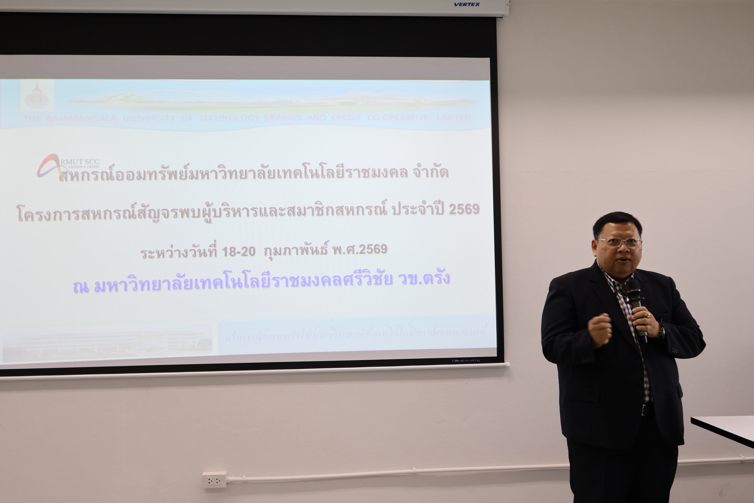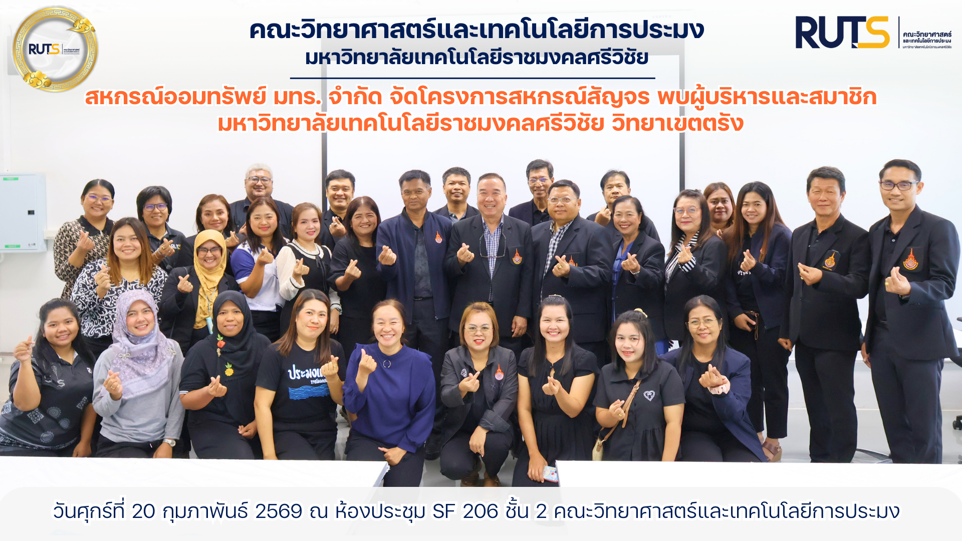 สหกรณ์ออมทรัพย์มหาวิทยาลัยเทคโนโลยีราชมงคล จำกัด จัดโครงการ “สหกรณ์สัญจรพบผู้บริหาร สมาชิกสหกรณ์ และผู้สนใจ” ภายใต้กิจกรรม “เยี่ยมเยียนสมาชิกและให้ความรู้สัญจร” เมื่อวันศุกร์ที่ 20 กุมภาพันธ์ 2569 ณ ห้องประชุม SF 206 ชั้น 2 คณะวิทยาศาสตร์และเทคโนโลยีการประมง