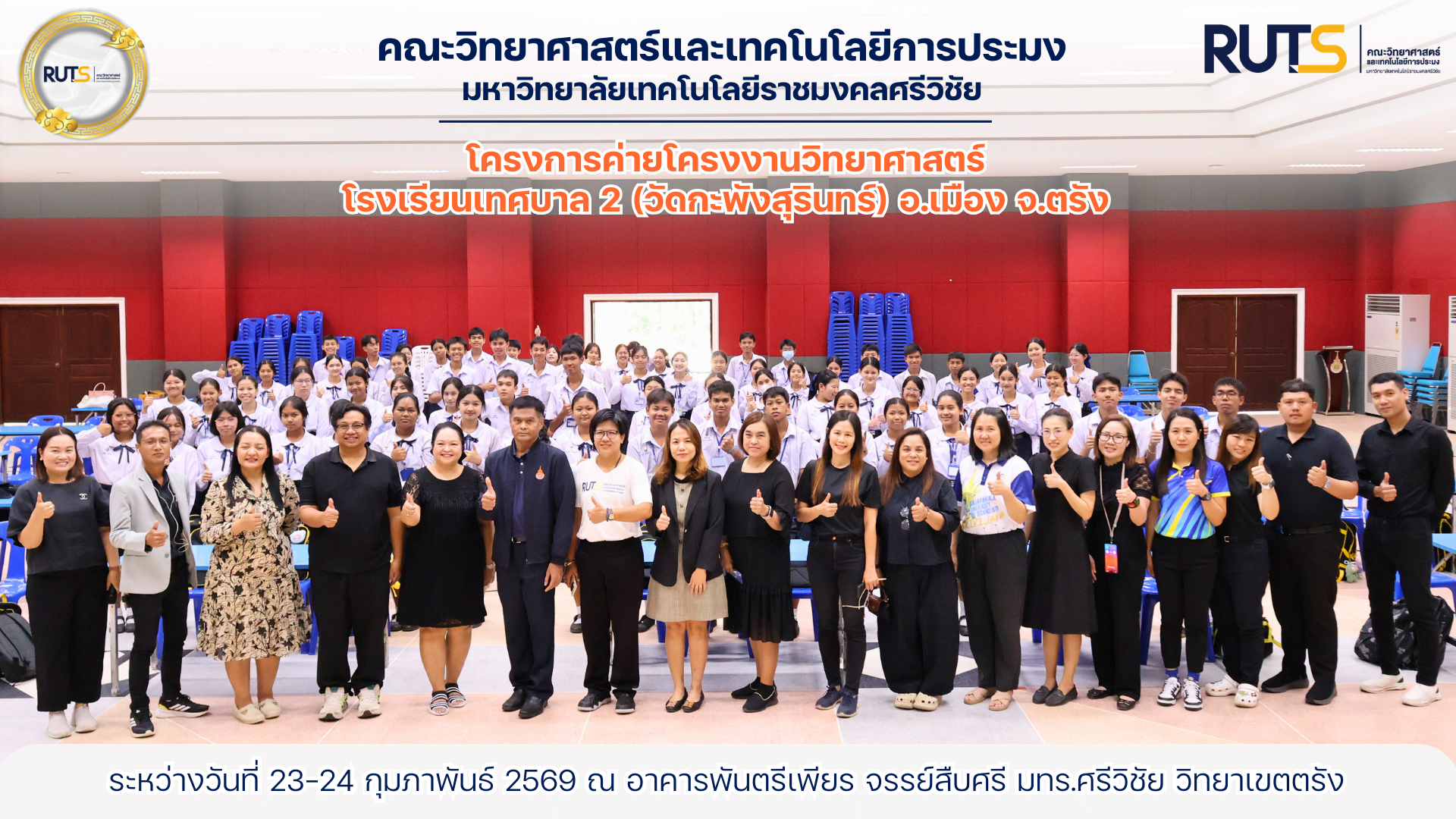 คณะวิทยาศาสตร์และเทคโนโลยีการประมง มหาวิทยาลัยเทคโนโลยีราชมงคลศรีวิชัย วิทยาเขตตรัง จัดโครงการ ค่ายโครงงานวิทยาศาสตร์ สำหรับนักเรียนชั้นมัธยมศึกษาปีที่ 4 จาก โรงเรียนเทศบาล 2 (วัดกะพังสุรินทร์) ระหว่างวันที่ 23 – 24 กุมภาพันธ์ 2569 ณ อาคารพันตรีเพียร จรรย์สืบศรี มทร.ศรีวิชัย วิทยาเขตตรัง