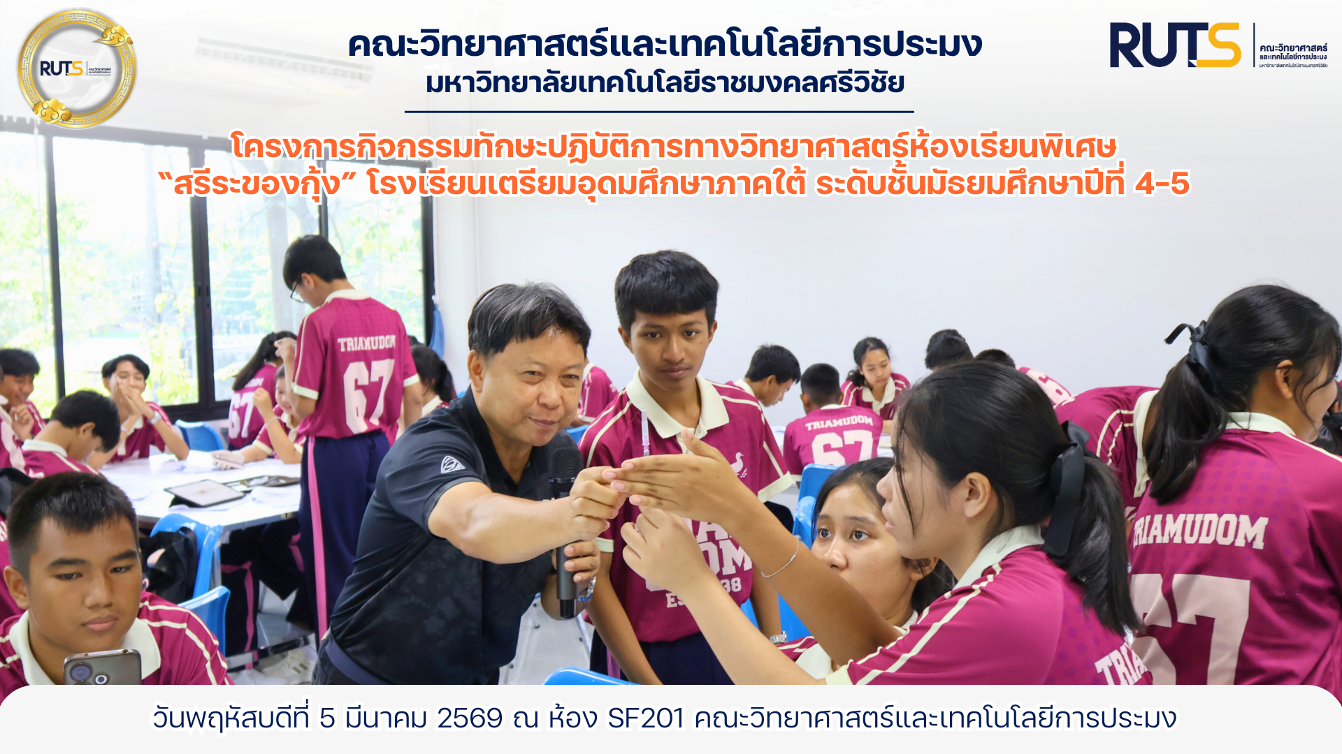 คณะวิทยาศาสตร์และเทคโนโลยีการประมง มหาวิทยาลัยเทคโนโลยีราชมงคลศรีวิชัย วิทยาเขตตรัง เปิดบ้านต้อนรับคณะครูและนักเรียนระดับชั้นมัธยมศึกษาปีที่ 4–5 จาก โรงเรียนเตรียมอุดมศึกษาภาคใต้ จังหวัดนครศรีธรรมราช เข้าร่วม “โครงการกิจกรรมทักษะปฏิบัติการทางวิทยาศาสตร์ห้องเรียนพิเศษ” เพื่อเปิดประสบการณ์การเรียนรู้ด้านวิทยาศาสตร์ผ่านกิจกรรมเชิงปฏิบัติการ