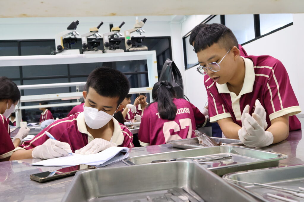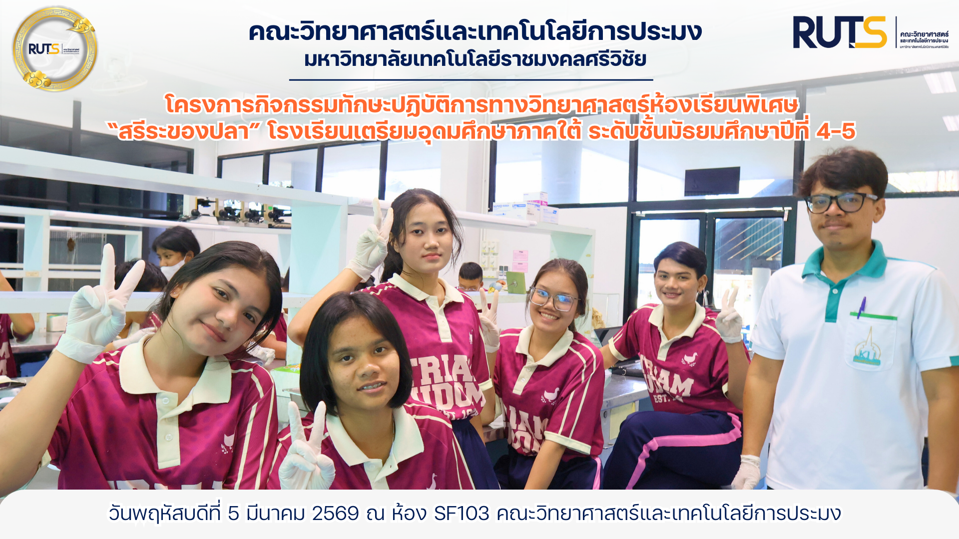 โดยมี ผู้ช่วยศาสตราจารย์ ดร.ปรีดา ภูมี และ อาจารย์ทินวุฒิ ล่องพริก เป็นวิทยากรถ่ายทอดความรู้ในกิจกรรม “สรีระของปลา” ให้น้อง ๆ ได้เรียนรู้ผ่านการลงมือปฏิบัติจริง ในวันพฤหัสบดีที่ 5 มีนาคม 2569 ณ ห้อง SF103 คณะวิทยาศาสตร์และเทคโนโลยีการประมง มทร.ศรีวิชัย วิทยาเขตตรัง