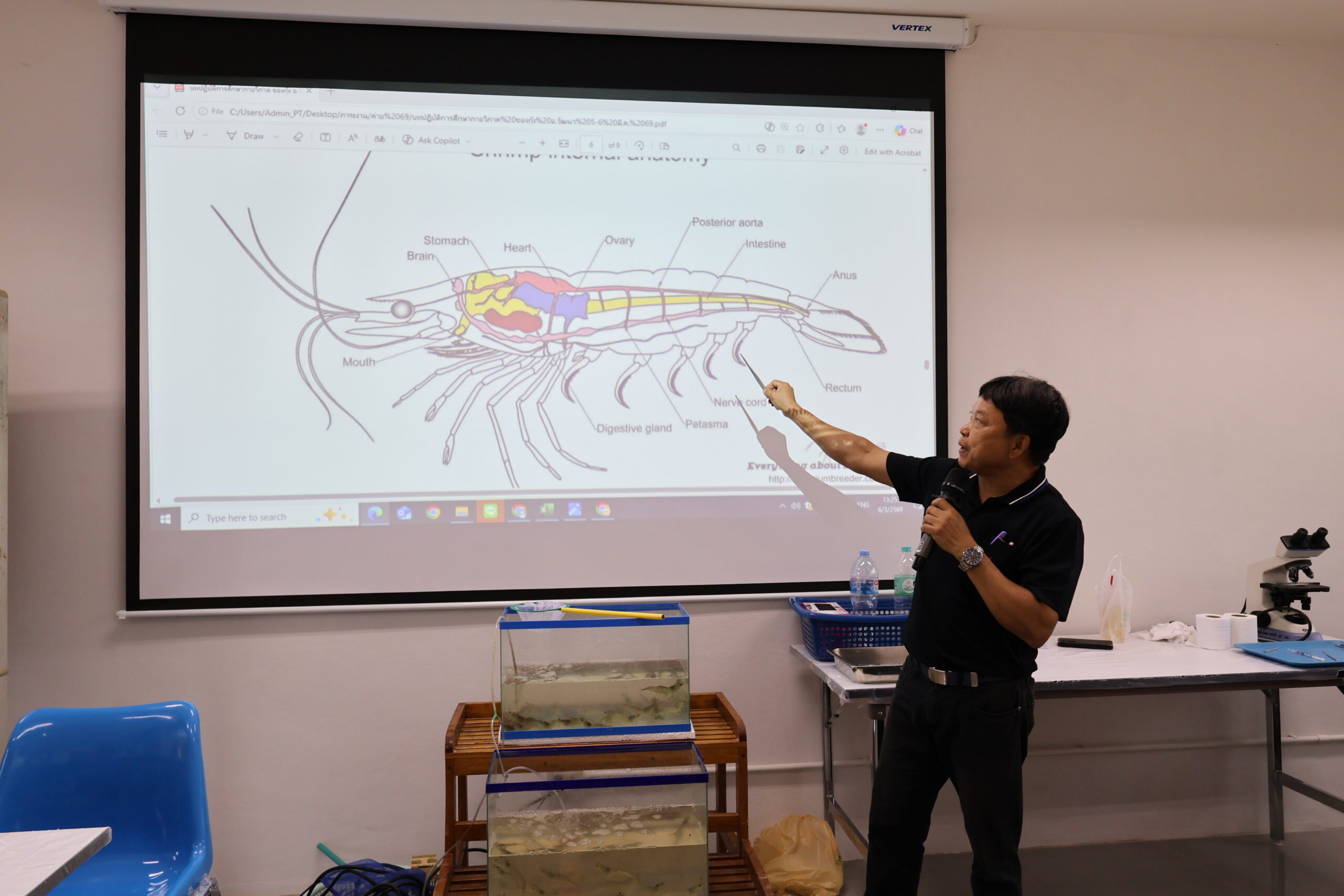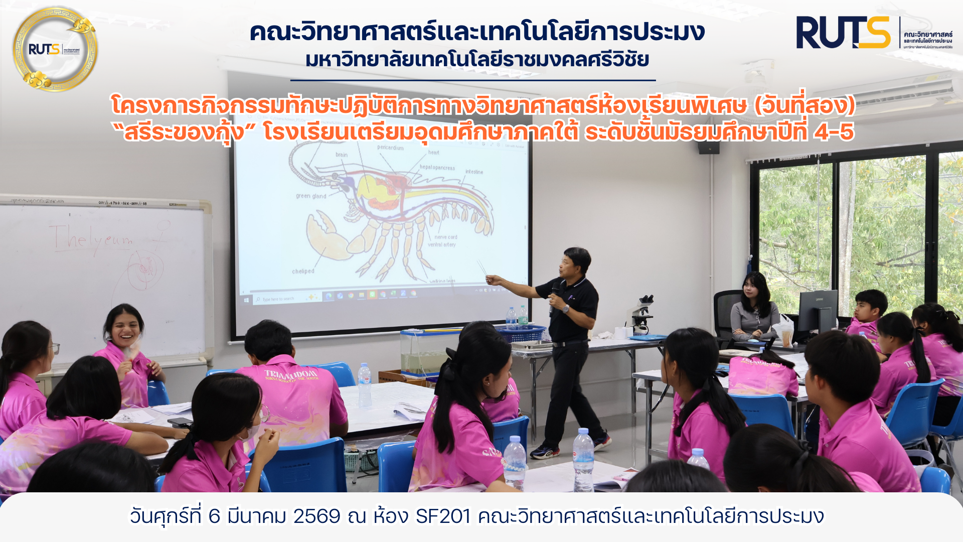 โดยมี รองศาสตราจารย์วัฒนา วัฒนกุล และ ผู้ช่วยศาสตราจารย์อุไรวรรณ วัฒนกุล เป็นวิทยากรถ่ายทอดความรู้ในกิจกรรม “สรีระของกุ้ง” ให้น้อง ๆ ได้เรียนรู้ผ่านการลงมือปฏิบัติจริง ในวันศุกร์ที่ 6 มีนาคม 2569 ณ ห้อง SF201 คณะวิทยาศาสตร์และเทคโนโลยีการประมง มทร.ศรีวิชัย วิทยาเขตตรัง